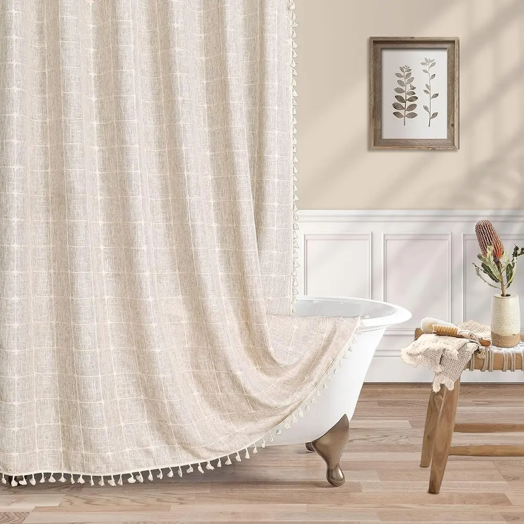 Wrinkle Free & Ultra Thick Fabric - 310 GSM cotton line creates farmhouse like effect for this tan shower curtain. Its weight is up to 2.65 pounds, so that it could keep in place. The quality curtain is elegant and soft, which can deliver a country-like bathroom environment. Boho Farmhouse Design - The rustic farmhouse shower curtain is elegant looking and adds a special country style to the bathroom. Simple geometric pattern and boho tassel elements is also very eye pleasing, which is suitable for master bathroom, guest bathroom. Rust-Resistant Metal Grommet Holes - The 72 inches farmhouse shower curtain have 12 stainless metal button holes and 12 free plastic hooks to guarantee no rust. Easy to Clean - The farmhouse fabric shower curtain is machine washable in cold water, dries quickly. Extra strong fabric and tight hem could avoid shrinkage and deformation. Warm Tips - The modern boho cloth shower curtain can resist water to some degree. Only a little bit of water will soak through, and most of the water will form water drops on the surface and quickly be repelled. Recommend using together with waterproof plastic shower curtain liner, If you pursue higher water resistance.