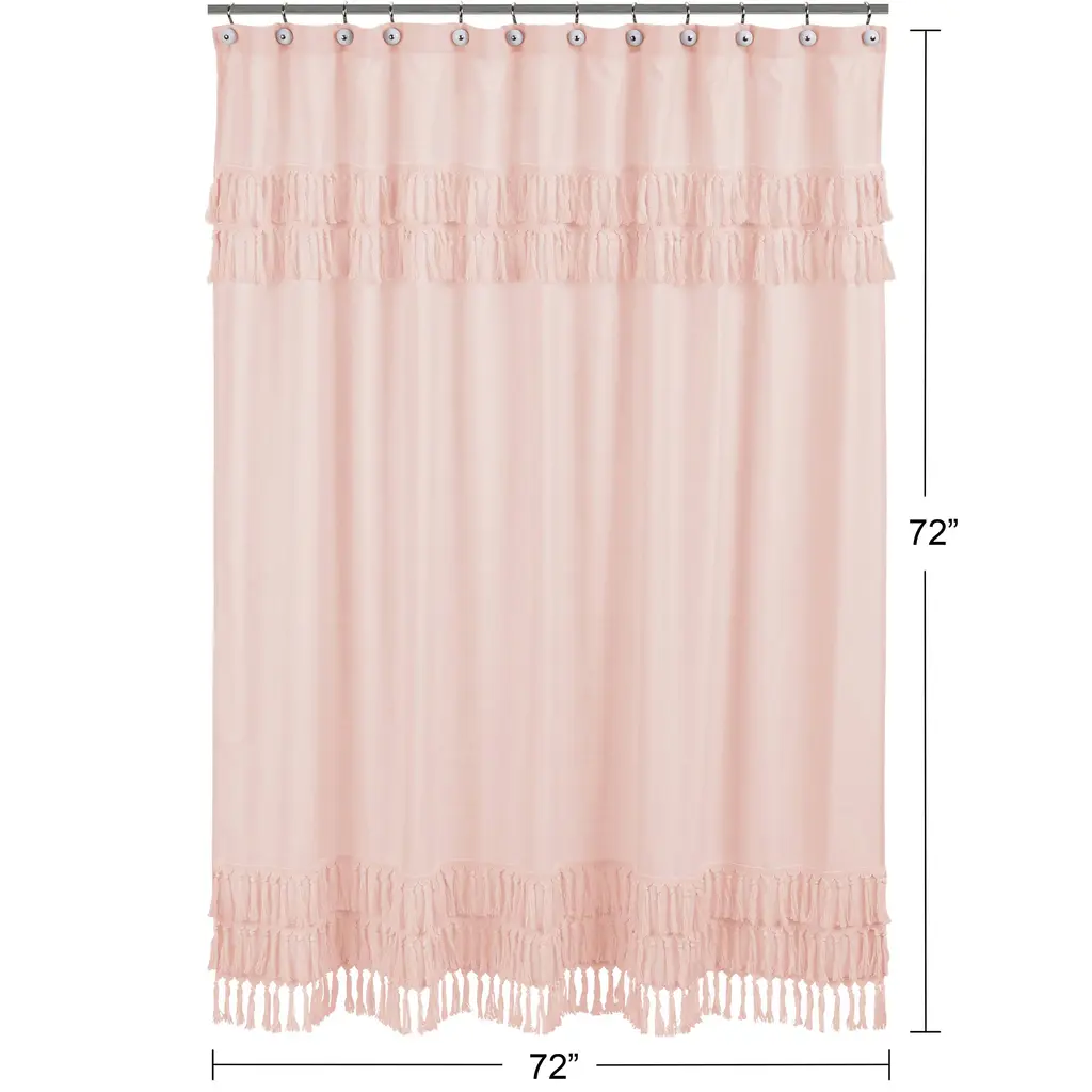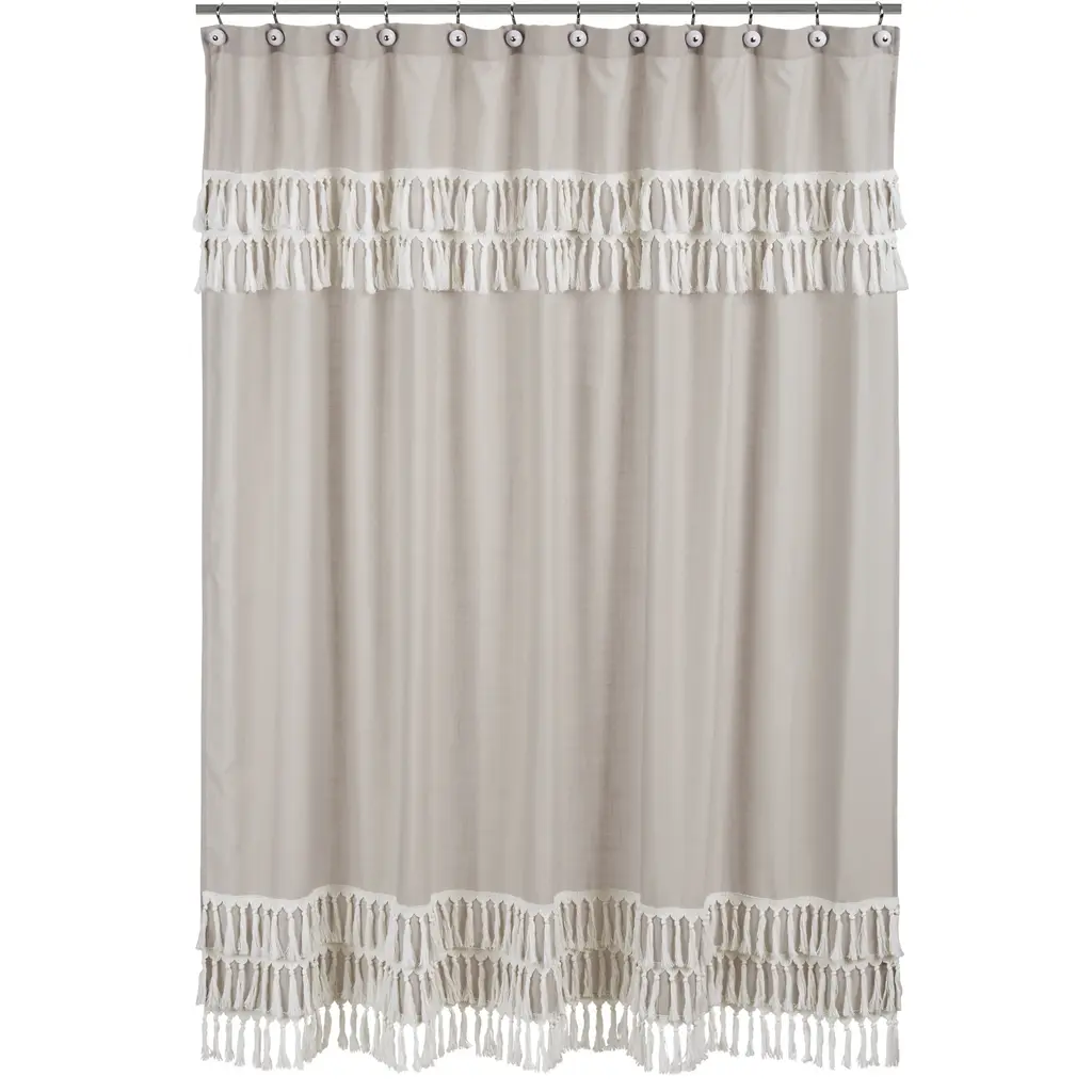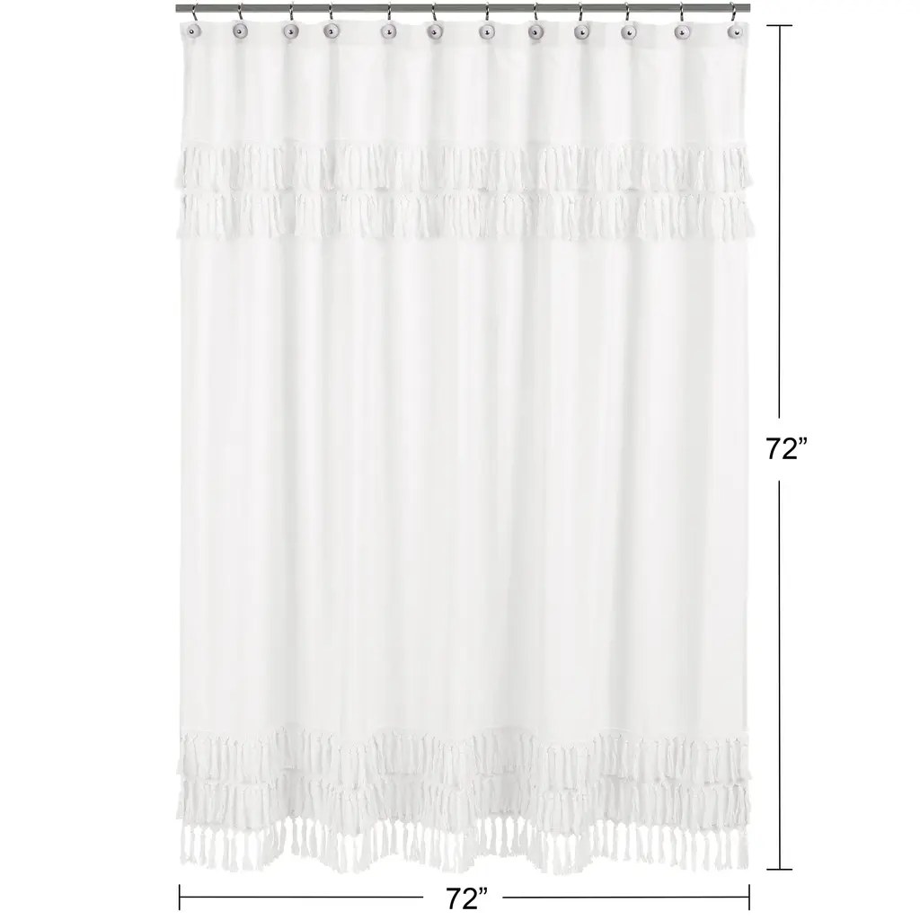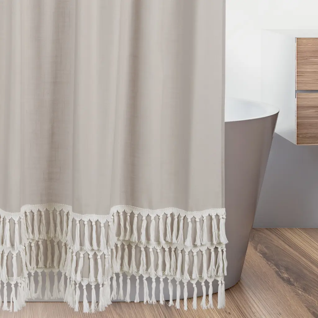 Transform your bathroom into a bohemian woodland oasis with this Boho Fringe Bathroom Fabric Bath Shower Curtain in beige, tan, and taupe. Made with high-quality linen material, this designer curtain adds a touch of style and color to your space. Measuring 72 inches by 72 inches, it fits most standard shower sizes. Easy to clean, simply throw it in the washing machine. Shower hooks and liners not included.Features: