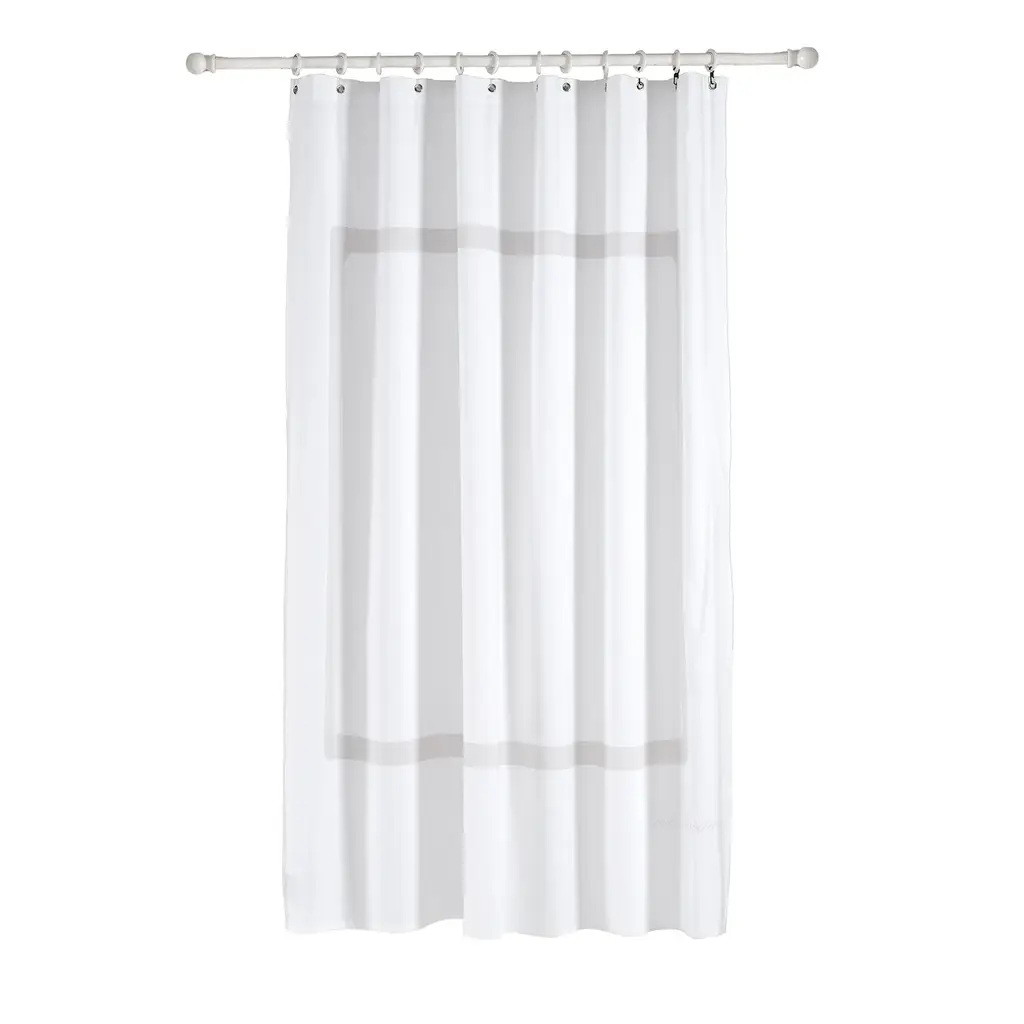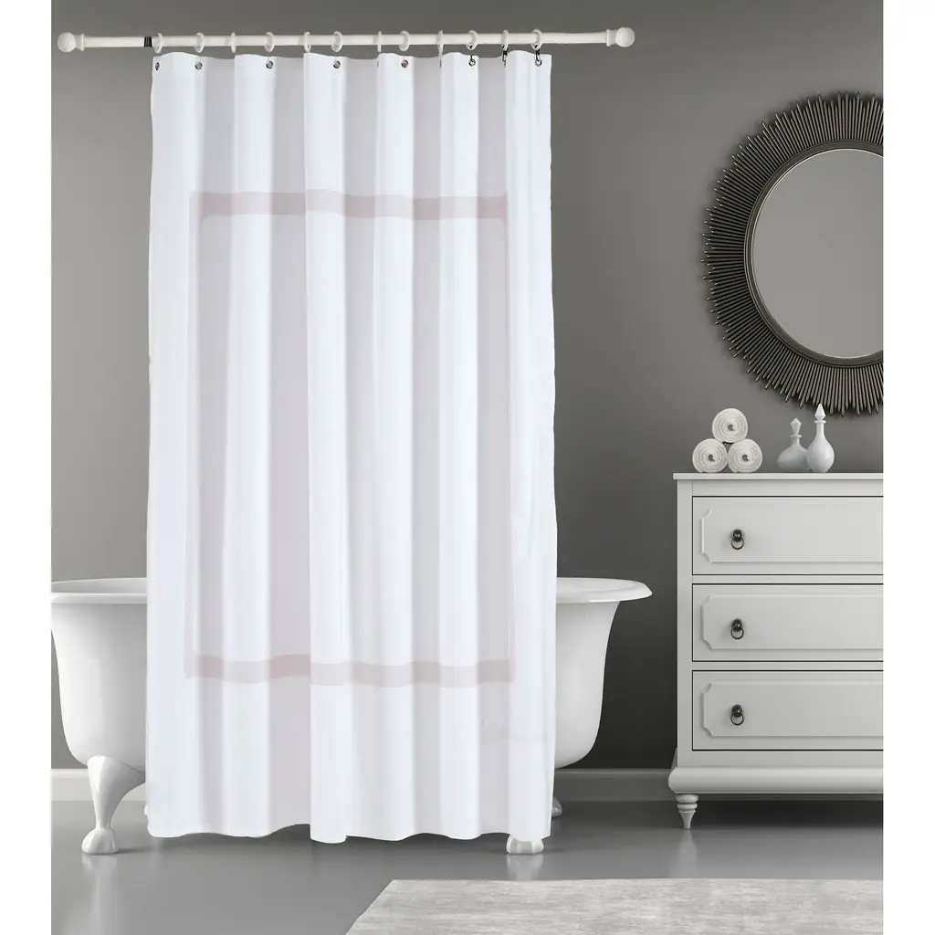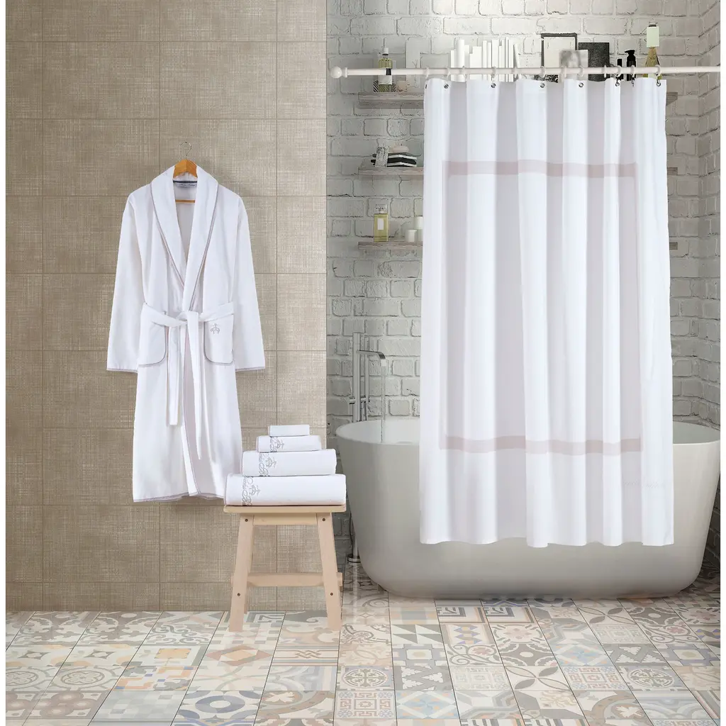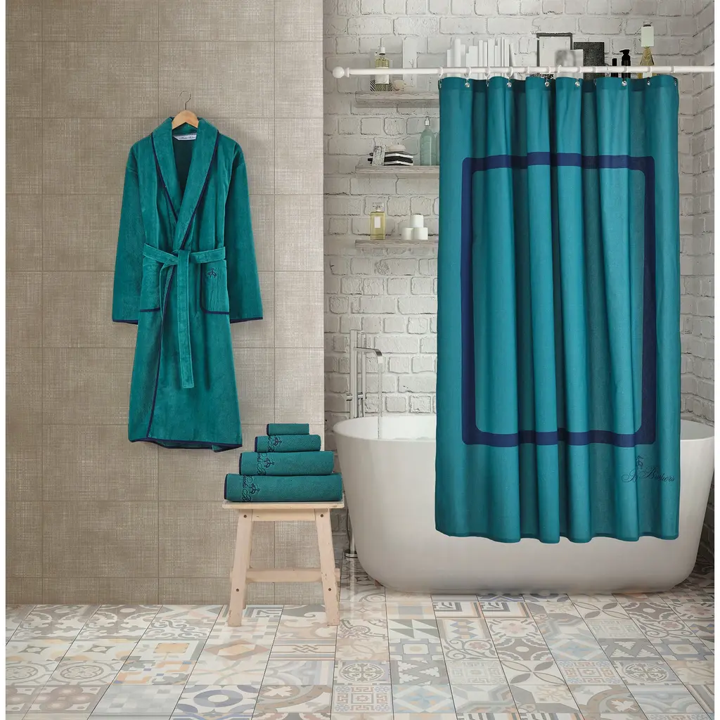 Brooks Brothers home collection Contrast Frame shower curtains have round edges and feature bright pattern in contrasting colors for unique and luxury look. Elegantly designed in a lavish size and weight for greater comfort, absorbency and usability. Each shower curtains are made from long-staple Turkish Cotton for maximum absorbency. The clean lines and a silky, smooth feel provide you an excellent comfort plus coziness for everyday use.Full towel range available to match including bath mats and shower curtainLong-staple Turkish cotton from the Aegean region makes the shower curtains more absorbent and durableIt gets softer and more divine after each wash Material; Turkish CottonMade in TurkeyShower Curtain: 72"L x 72"WMachine Washable