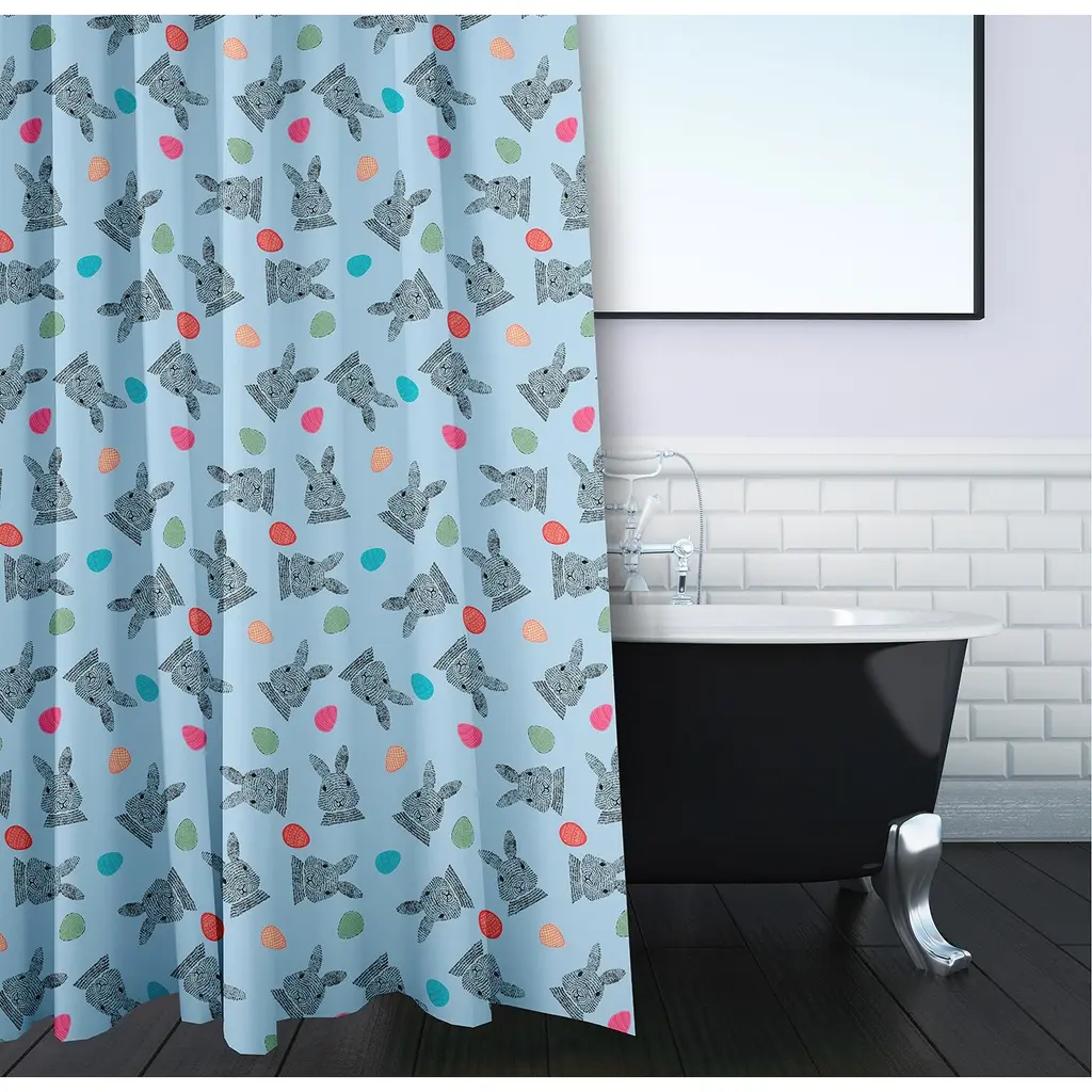 Enjoy a new style this season with a Bunnies and Eggs Shower Curtain from our Funky Junky Collection. This durable and decorative polyester fabric shower curtain has a single sided design and a buttonhole top to easily refresh your bath for each season. It is made of 100% polyester that is quick drying. When it needs to be washed, just toss it into your washing machine, and then tumble dry. Everyone will enjoy the charm and style brought to your bath space by this decorative shower curtain! The combination of bright colors and charming designs from this collection are the perfect way to enliven your home decor.