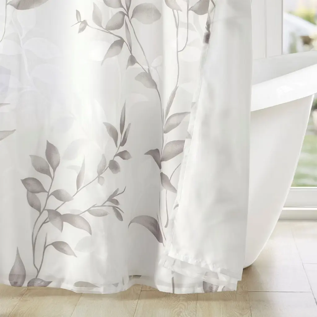 Transform your bathroom with the beauty of Madison Park’s Cecily Printed Shower Curtain. The gorgeous shower curtain flaunts a stunning allover grey botanical design with burnout detailing for beautiful contrast and dimension. Non-absorbent water coat will help to bead water on fabric and glide down which provides quick dry and keeps fabric looking tidy, separate liner is still recommended and can be purchased seperately. Machine washable for easy care; Each shower curtain measure 72"x72" and is finished with 12 button holes at the top making it easy to hang; hooks and rod are not included and will need to be purchased separately. Complete the look with coordinating Window panel, available and sold separately.
