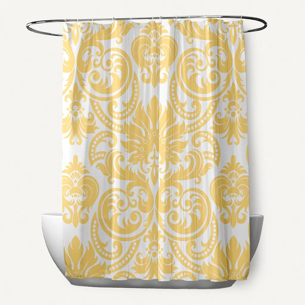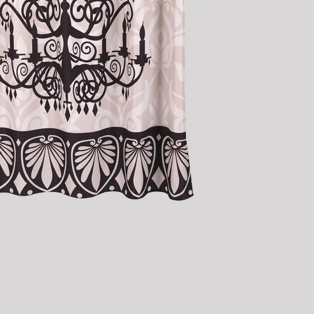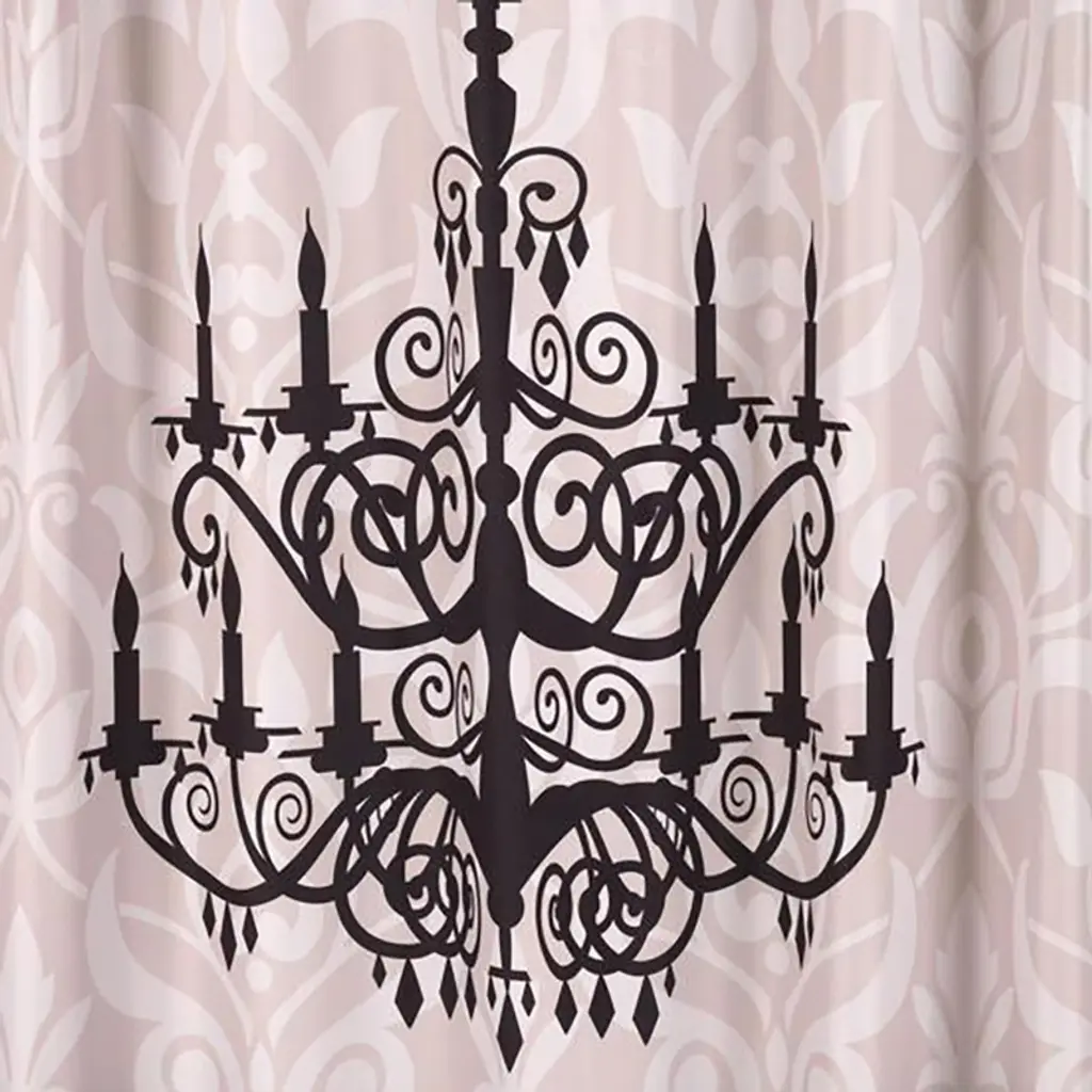 "Luminere" Heavier Weight Fabric shower curtain 100% polyester size 70"x72" With it's bold chandelier design our "Luminere" Fabric Shower Curtain will light up your bathroom. Made to fit standard-sized bathtubs or showers (curtain measuring 70'' w x 72'' l) "Luminere" is made with a premium quality polyester fabric giving it added weight and durability. This curtain is both machine-washable and water repellant (no liner required).