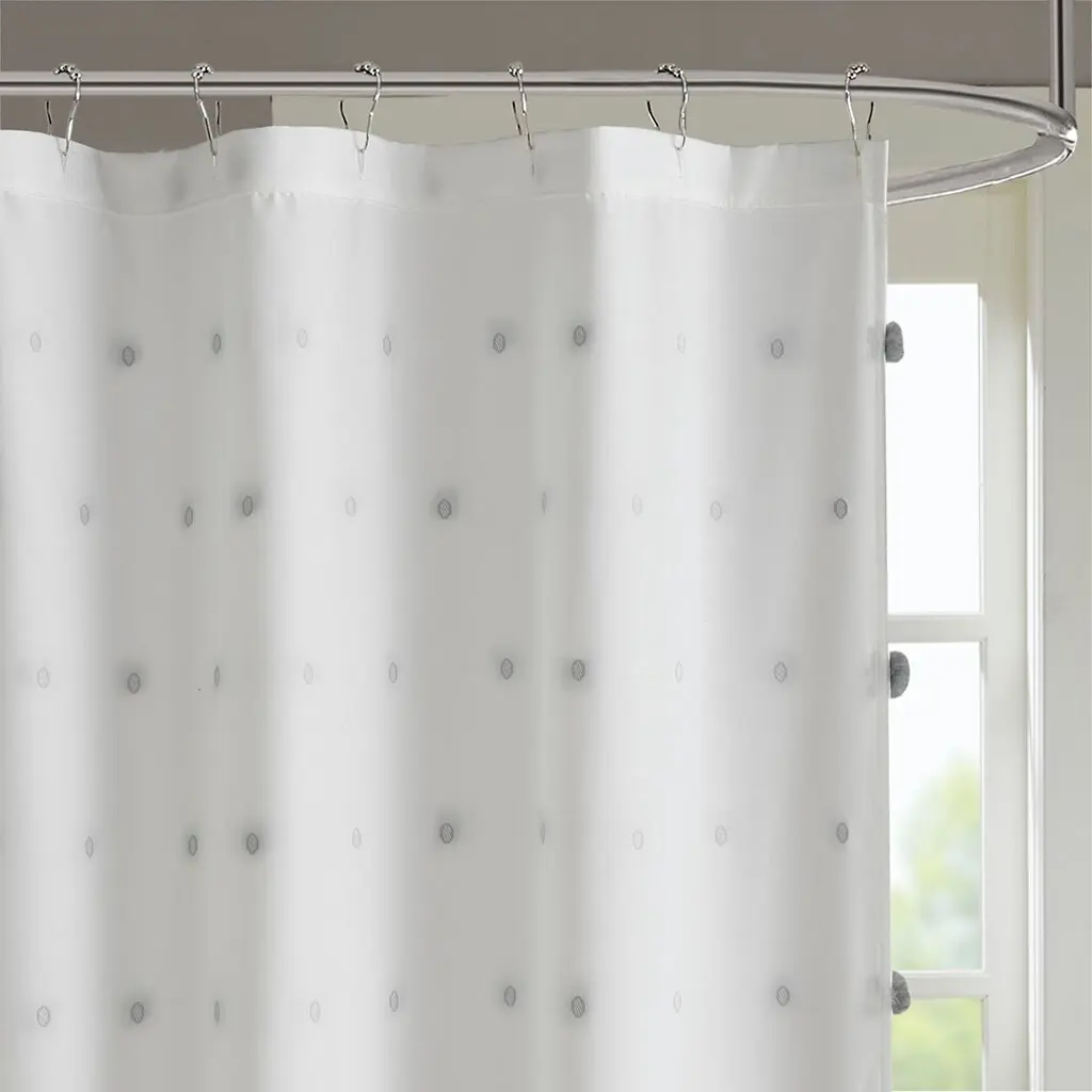 DescriptionAdd a fun update to your space with the Madison Park Sophie shower curtain. The solid white background features rows of soft black fabric pom poms, adding beautiful texture and a stylish update to any bathroom. Machine Washable for easy care; Each shower curtain measure 72"x72" and is finished with 12 button holes at the top making it easy to hang; hooks, rod, and a water repellant liner are not included and will need to be purchased separately. Product FeaturesProduct Details