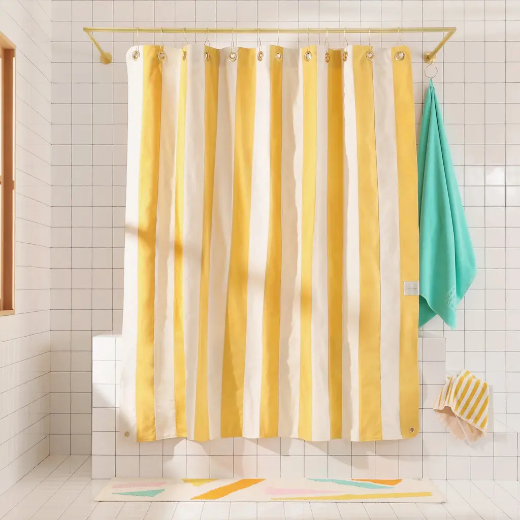 Introducing the Catalina curtain. Inspired by seaside awning stripes in a 80's palette. The stripes are constructed by sewing strips of heavy canvas together using a double-needle stitch just like a pair of vintage jeans.