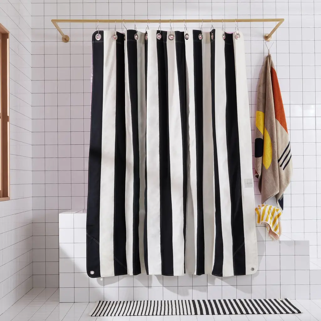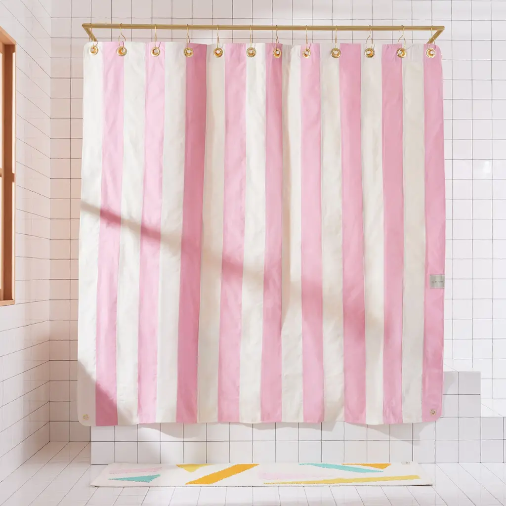 Introducing the Catalina curtain. Inspired by seaside awning stripes in a 80's palette. The stripes are constructed by sewing strips of heavy canvas together using a double-needle stitch just like a pair of vintage jeans.