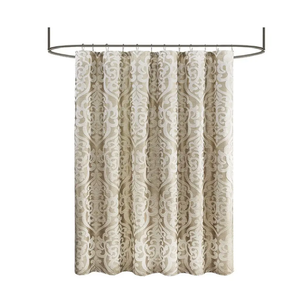 The shower curtain uses striped brown jacquard as the base fabric, decorated with ivory damask badges, showing a rich texture and three-dimensional sense, bringing a luxurious visual effect. This shower curtain is made of high-quality polyester and is durable. This shower curtain supports machine washing, which is simple and efficient to clean.