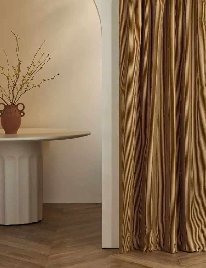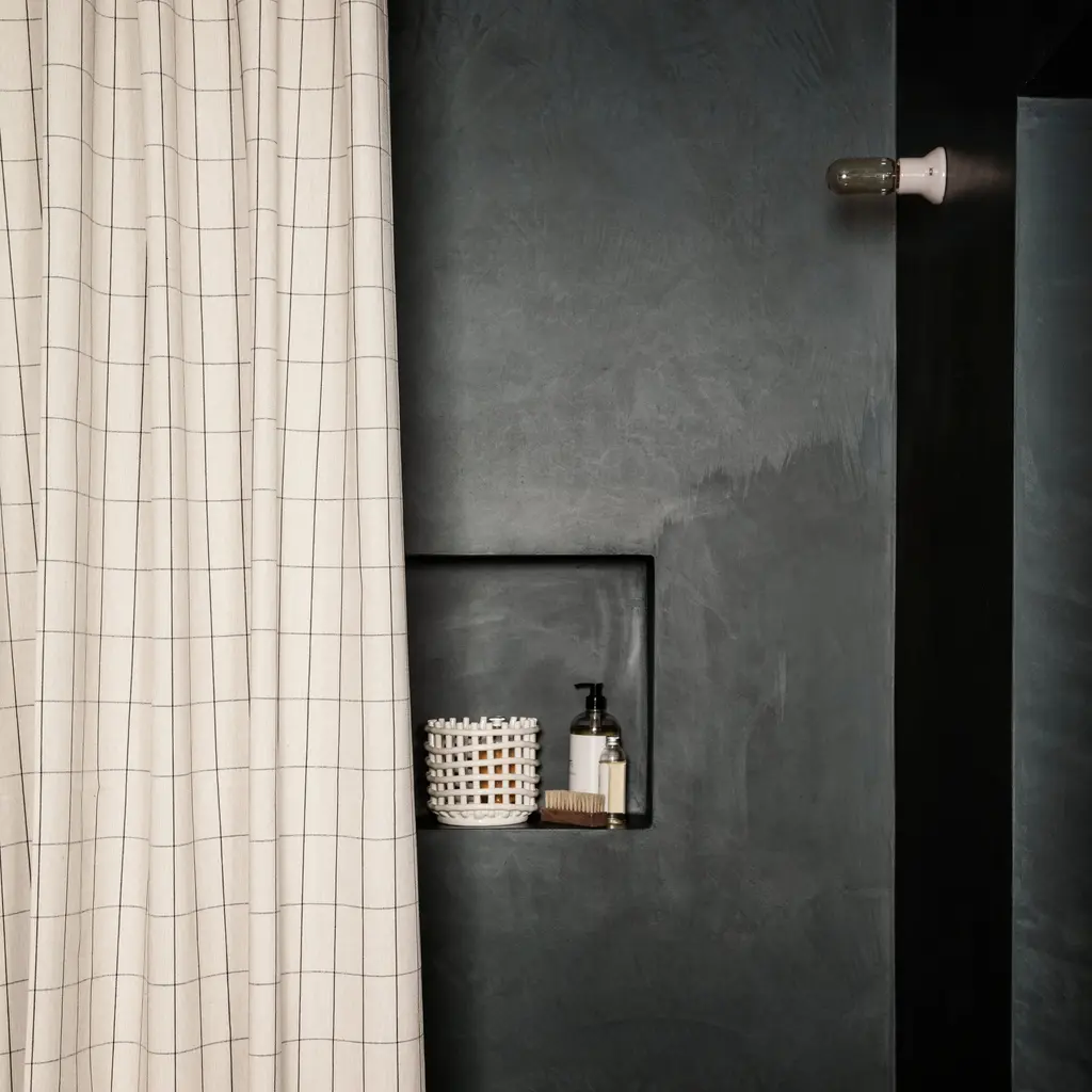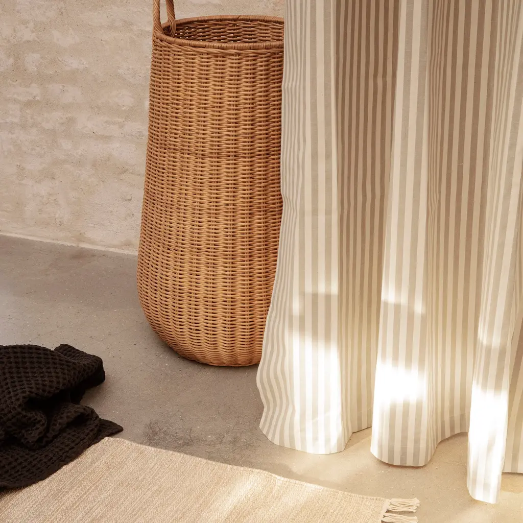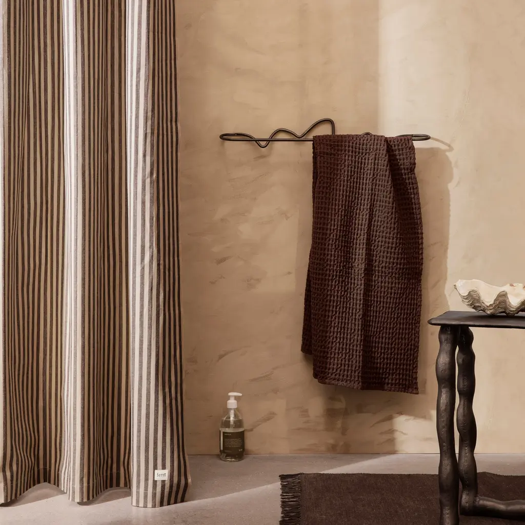 Ferm Living’s coated chambray version makes for a handsome and lighter, less clingy shower curtain. Similar to classic denim but with a finer weave, the fabric’s acrylic coating on the inside makes it water-resistant and eliminates the need for a separate liner. In subtle solid hues or classic pinstripe, the curtain comes with stainless-steel rings and eyelets.