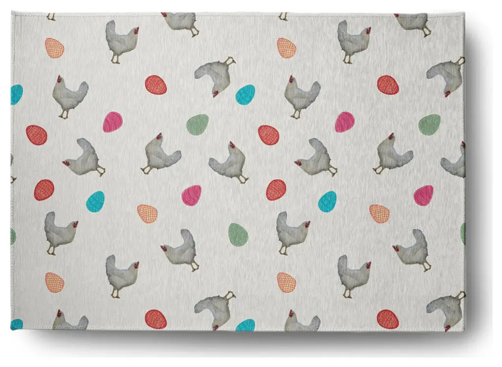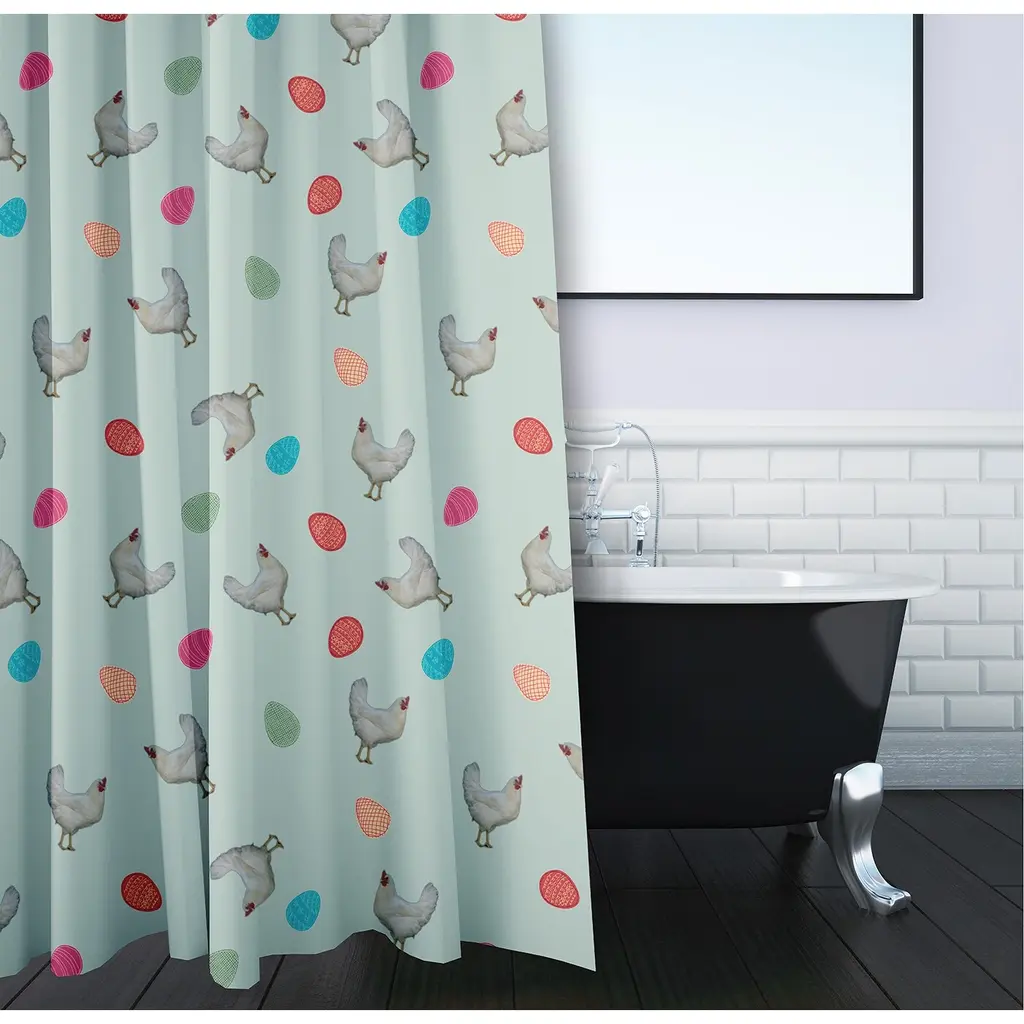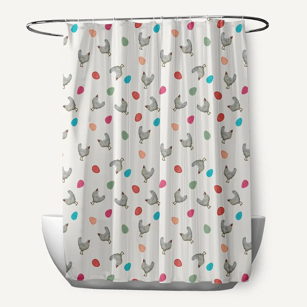 Enjoy a new style this season with a Chickens and Eggs Shower Curtain from our Funky Junky Collection. This durable and decorative polyester fabric shower curtain has a single sided design and a buttonhole top to easily refresh your bath for each season. It is made of 100% polyester that is quick drying. When it needs to be washed, just toss it into your washing machine, and then tumble dry. Everyone will enjoy the charm and style brought to your bath space by this decorative shower curtain! The combination of bright colors and charming designs from this collection are the perfect way to enliven your home decor.