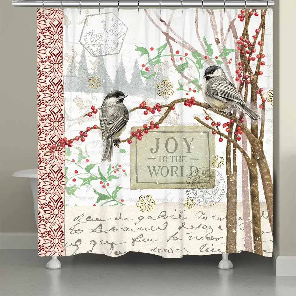You'll appreciate the nostalgic feel that this rustic shower curtain induces, from the detail of the handwritten postcard at the bottom to the reference to the Christmas classic Joy to the World. The "Christmas Birds" shower curtain features two birds resting on branches that stand out against the white snow, which is complemented by red and green holly. This peaceful holiday decor is the perfect Christmas accent for your bathroom.Artwork by Tim Coffey, Presented by Laural Home®All of our products are digitally printed to create crisp, vibrant colors and images. Made to order in the USA on imported fabric. Please allow 5-7 days for items to ship.