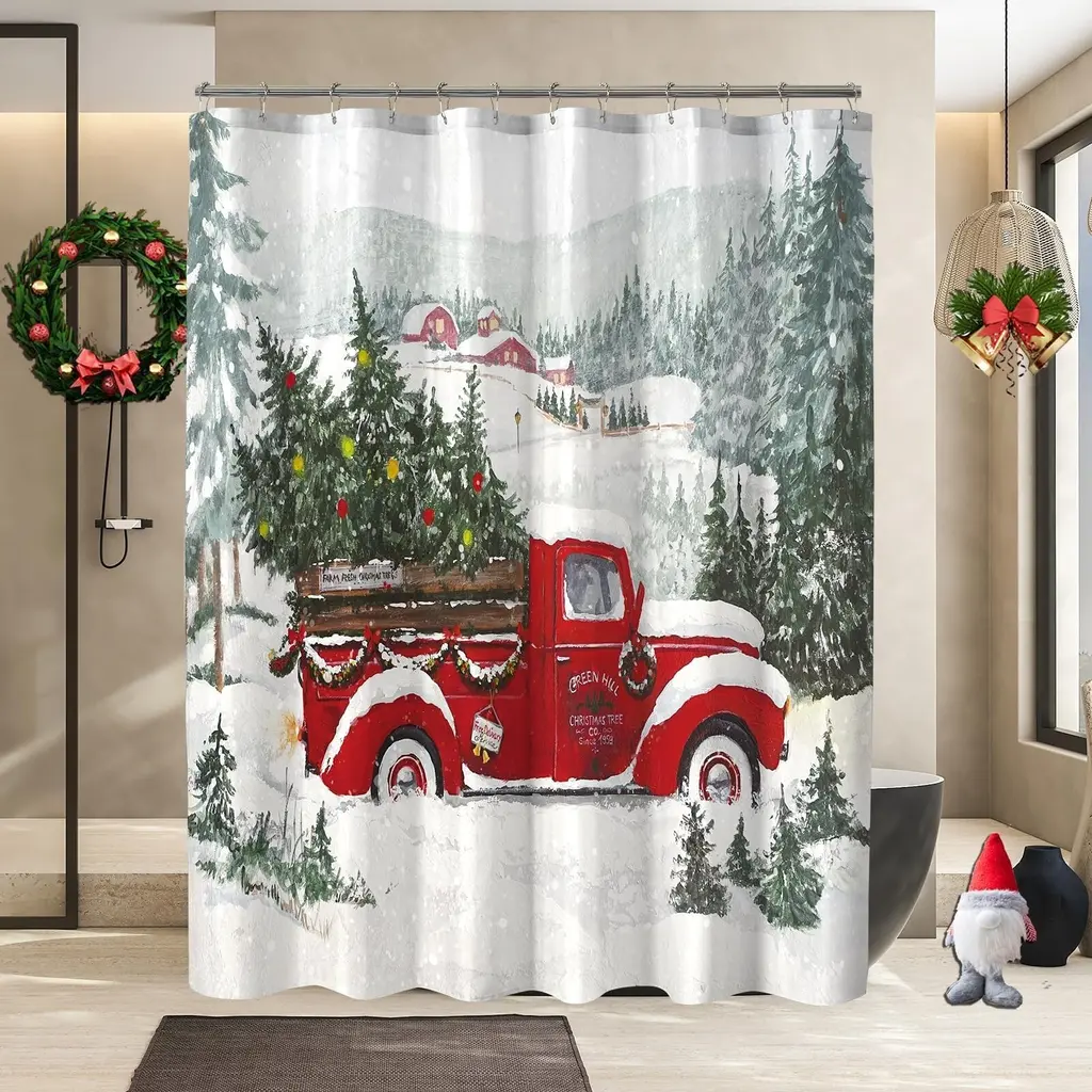 Celebrate the holiday season with our Christmas Shower Curtain, featuring a charming design of a classic red truck carrying a beautifully decorated tree. Measuring 72" x 72", this rustic curtain brings a warm and nostalgic touch to your bathroom decor. Crafted from high-quality, water-resistant fabric, it ensures both style and functionality, providing privacy while preventing water splashes. The vibrant colors and festive imagery evoke the spirit of Christmas, making it a perfect addition to any rustic or farmhouse-themed home. Easy to install and machine washable, this shower curtain is a delightful way to enhance your holiday ambiance. Transform your bathroom into a cozy retreat with this enchanting decor piece!
