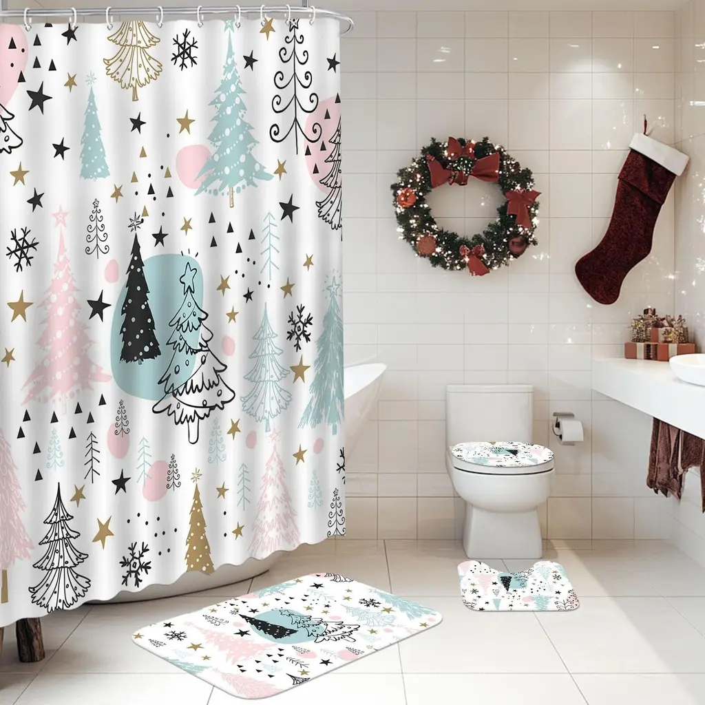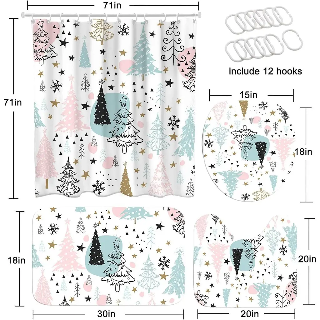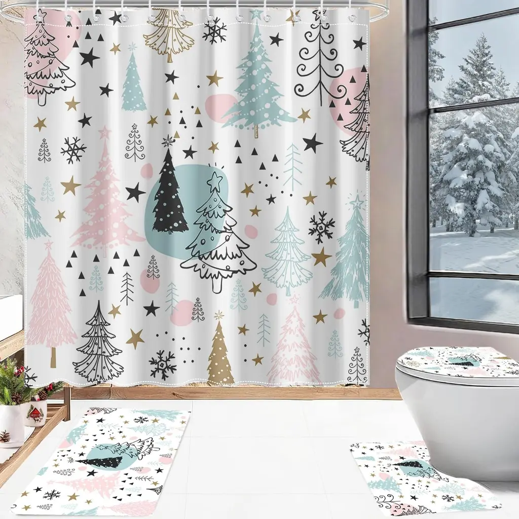 Christmas Shower Curtain Set - 4Pcs Winter Pine Tree Decor, 70.8" - Multicolor