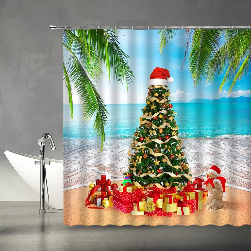 Bring a unique blend of holiday cheer and tropical vibes to your bathroom with our Christmas Tree Shower Curtain, featuring a vibrant tropical beach design. Measuring 70x70 inches, this eye-catching curtain showcases a beautifully decorated Christmas tree set against a sunny beach backdrop, merging festive spirit with coastal charm. Made from high-quality, water-resistant fabric, it ensures durability and easy maintenance for everyday use. The bright colors and playful imagery create a cheerful atmosphere, making your space feel warm and inviting during the holiday season. Celebrate Christmas in style with this fun and tropical shower curtain that adds a refreshing flair to your decor!