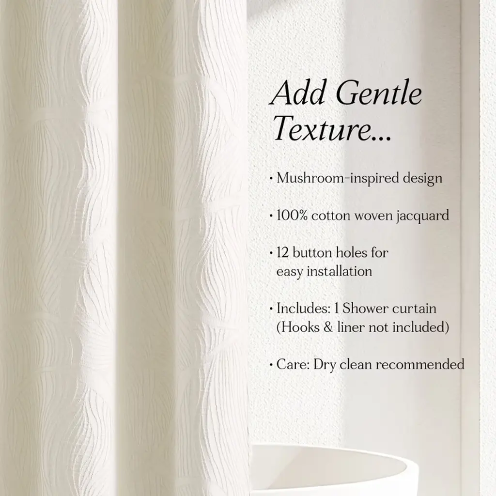Influenced by nature's organic beauty, the Capstone Whisper Shower Curtain will be the focal point of your bathroom decor. Beautifully woven, the delicate ridges of this jacquard reflect the intricate, rhythmic patterns found beneath a mushroom cap. This modern bath curtain measures 72" W x 72" L. Installation is easy with 12 button holes at the top to hang with shower hooks or rings. Pair this fabric shower curtain with a liner, sold separately. STANDARD 100 by OEKO-TEX¨ certified, all components have been tested and certified free from harmful substances. Dry clean only for best results.