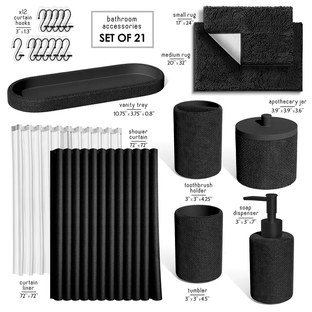 Clara Clark Complete Bathroom Accessories Set Shower Curtain, Bath Rugs & Shower Caddies - Black - Complete Set + Bath Rugs