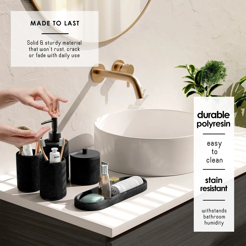 Transform your bathroom into a stylish haven with our burlap-texture polyresin bathroom accessory set. Designed to combine elegance with functionality, this set adds a modern and sophisticated touch to your space while offering exceptional durability. Whether you're updating your bathroom decor or creating a cohesive design, these beautiful and practical pieces are crafted to enhance your daily routine and elevate the overall ambiance of your home.