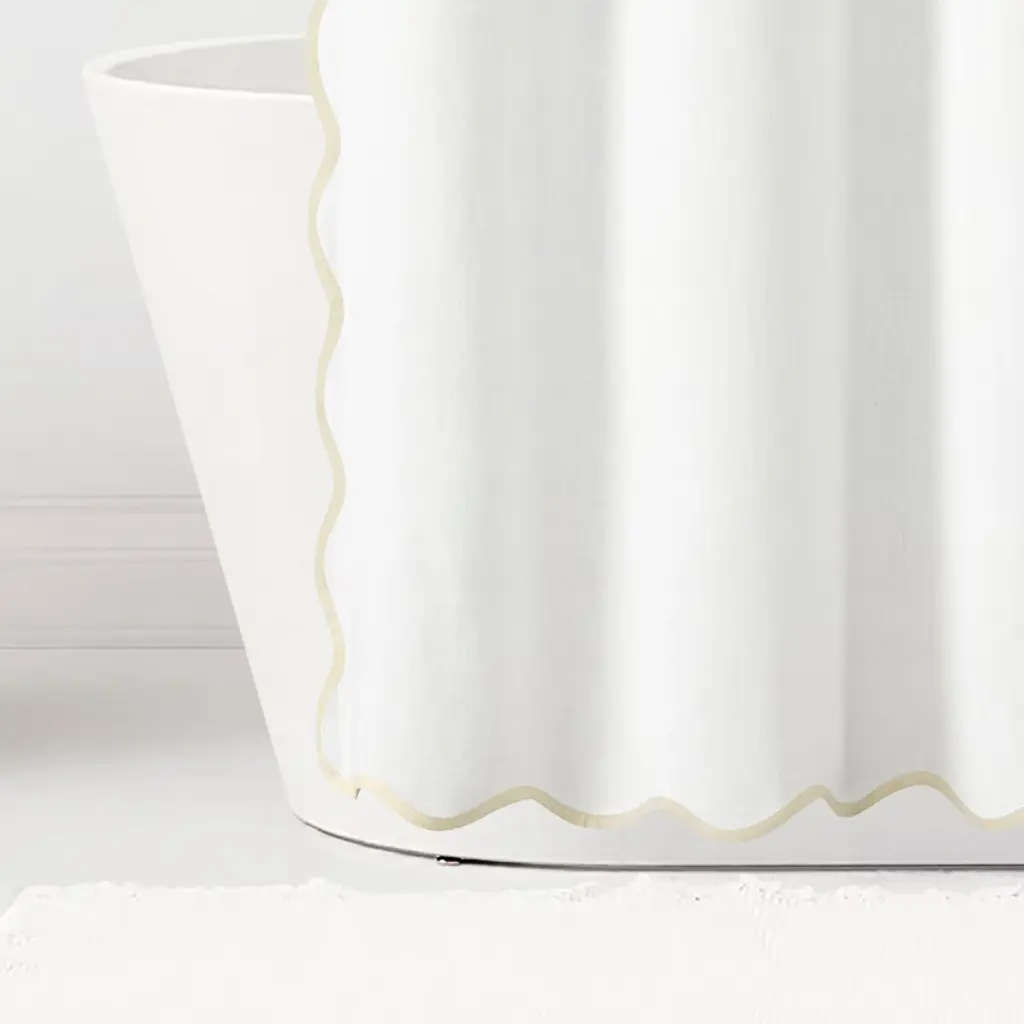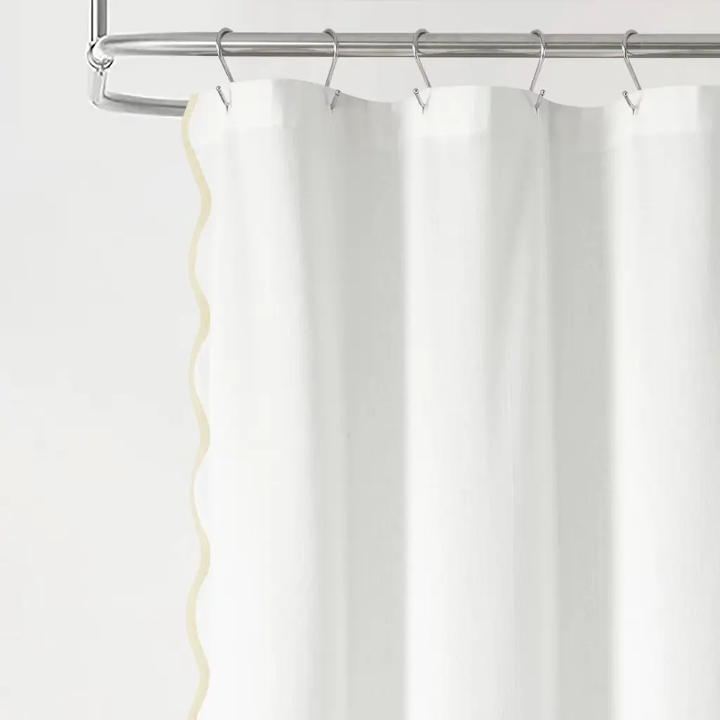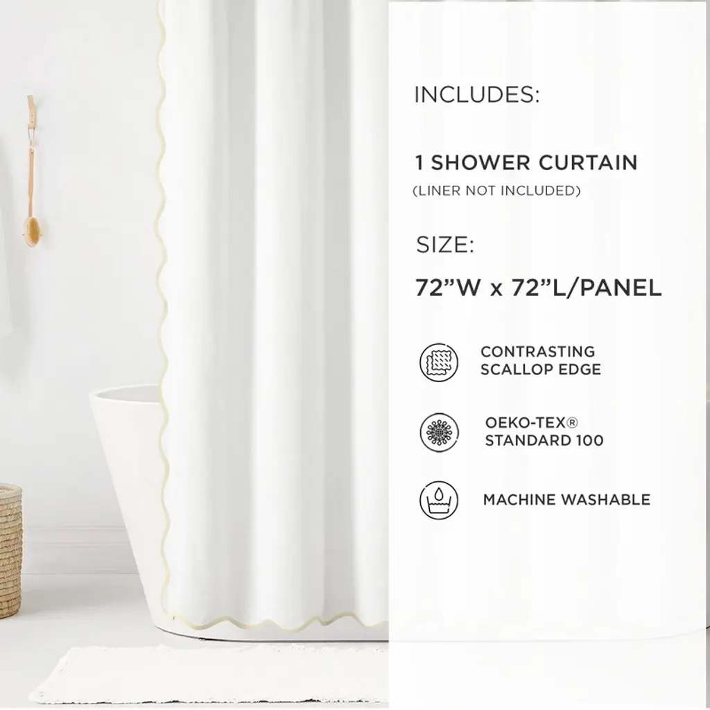 Bring a blend of seaside charm and style to your bathroom with this Coastal Chic Scallop Edge Shower Curtain. The scalloped edge design, reminiscent of the rolling waves along the shoreline, infuses your bathroom with a tranquil coastal ambiance. This coastal shower curtain features a solid white color with a contrasting color binding on the scallop edge. Perfect for coastal, modern, or minimalist decor style bathrooms. With a selection of soothing coastal colors, you can customize your bathroom decor effortlessly. This white shower curtains for bathroom measures 72 inches wide by 72 inches long and will complement your coastal bathroom decor beautifully. Crafted from a linen-textured cotton fabric blend. The 12 button holes at the top of this bathroom shower curtain make it easy to hang with hooks or rings (not included). Because this is a fabric shower curtain, we recommend pairing it with a liner, sold separately. Create a serene, resort-like feel in your bathroom with this chic shower curtain. To care for this bathroom curtain, simply machine wash separately in cold water on the gentle cycle and tumble dry low. Use an iron on low heat to release wrinkles if needed.