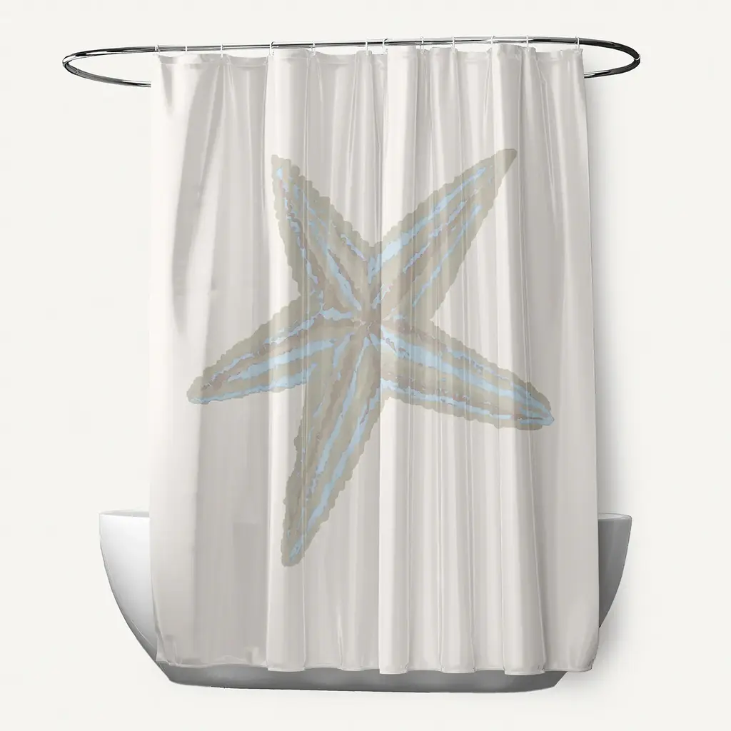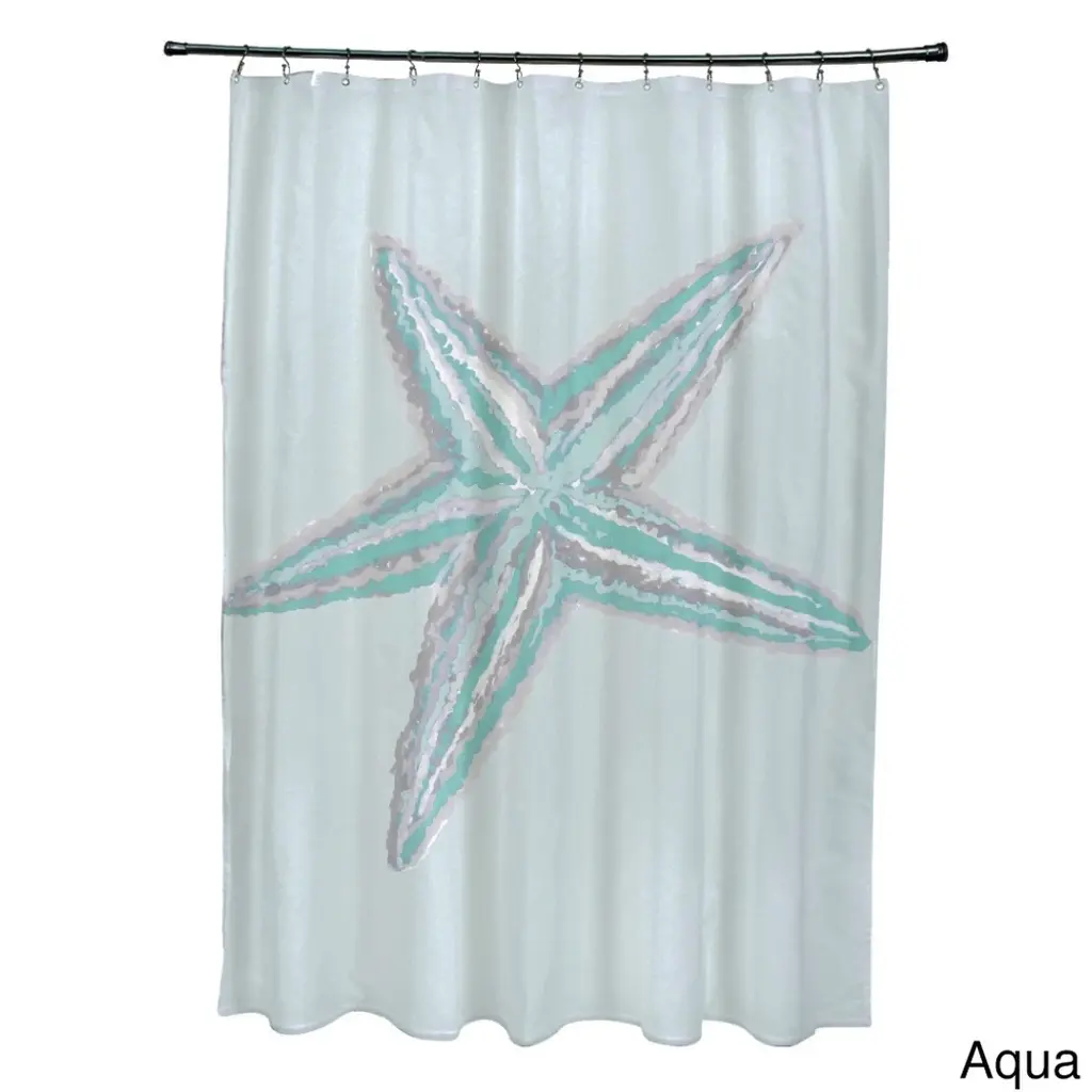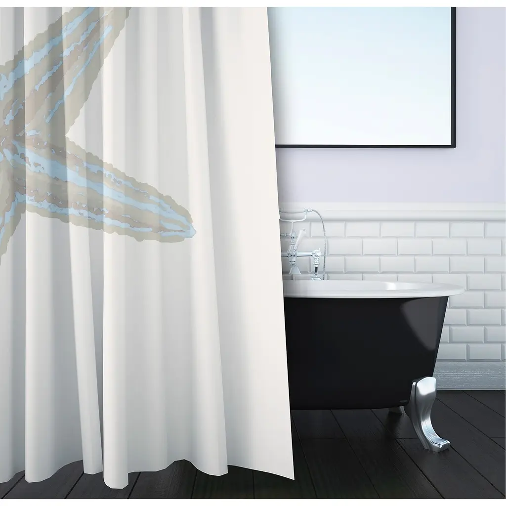 Bring the beach to your bathroom with our Coastal Starfish Print Shower Curtain. This shower curtain from our Beach Vacation Collection features a colorful and vibrant design that will enliven your bathroom decor with a coastal vibe. Made from durable polyester fabric, this shower curtain is quick drying and machine washable for easy maintenance. Measuring 71" x 74", it comes with 12 button holes for easy hook placement. Choose between the ivory or aqua color options to complement your bathroom's style.Features: