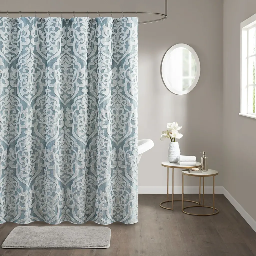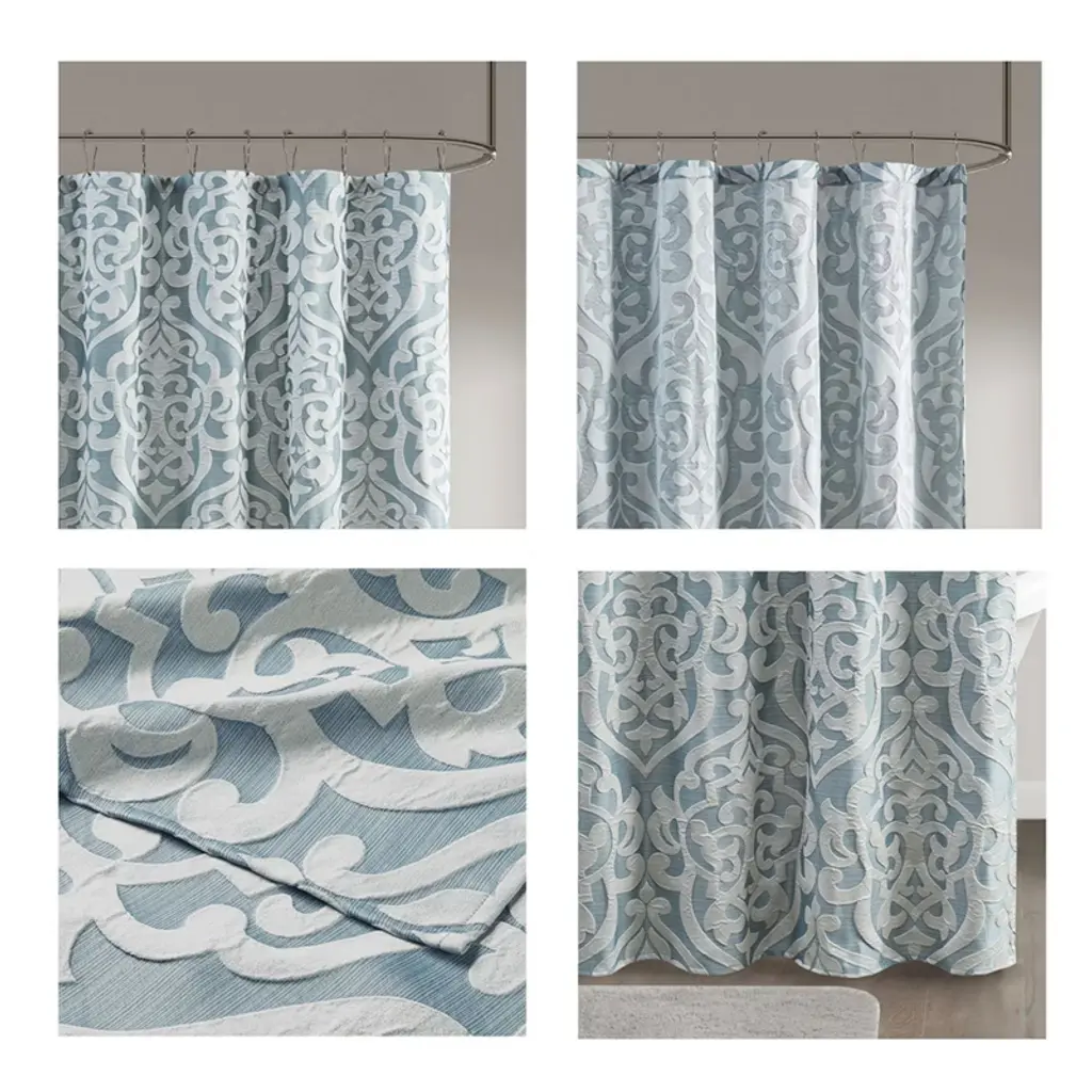 Add a touch of class to your bathroom with our Madison Park Odette Jacquard Shower Curtain. This luxurious textured shower curtain flaunts a gorgeous silver damask medallion design on a stria navy jacquard ground that adds rich texture and dimension to the lavish look. Measuring 72x72", each shower curtain is finished with 12 button holes on top making it easy to assemble hooks and hang onto rod (hooks and rod not included). To better preserve this beautiful shower curtain, a water repellant liner is highly recommended and can be purchased separately (liner not included). Machine washable for easy care; complete the collection with coordinate matching bedding, alas available and sold separately.