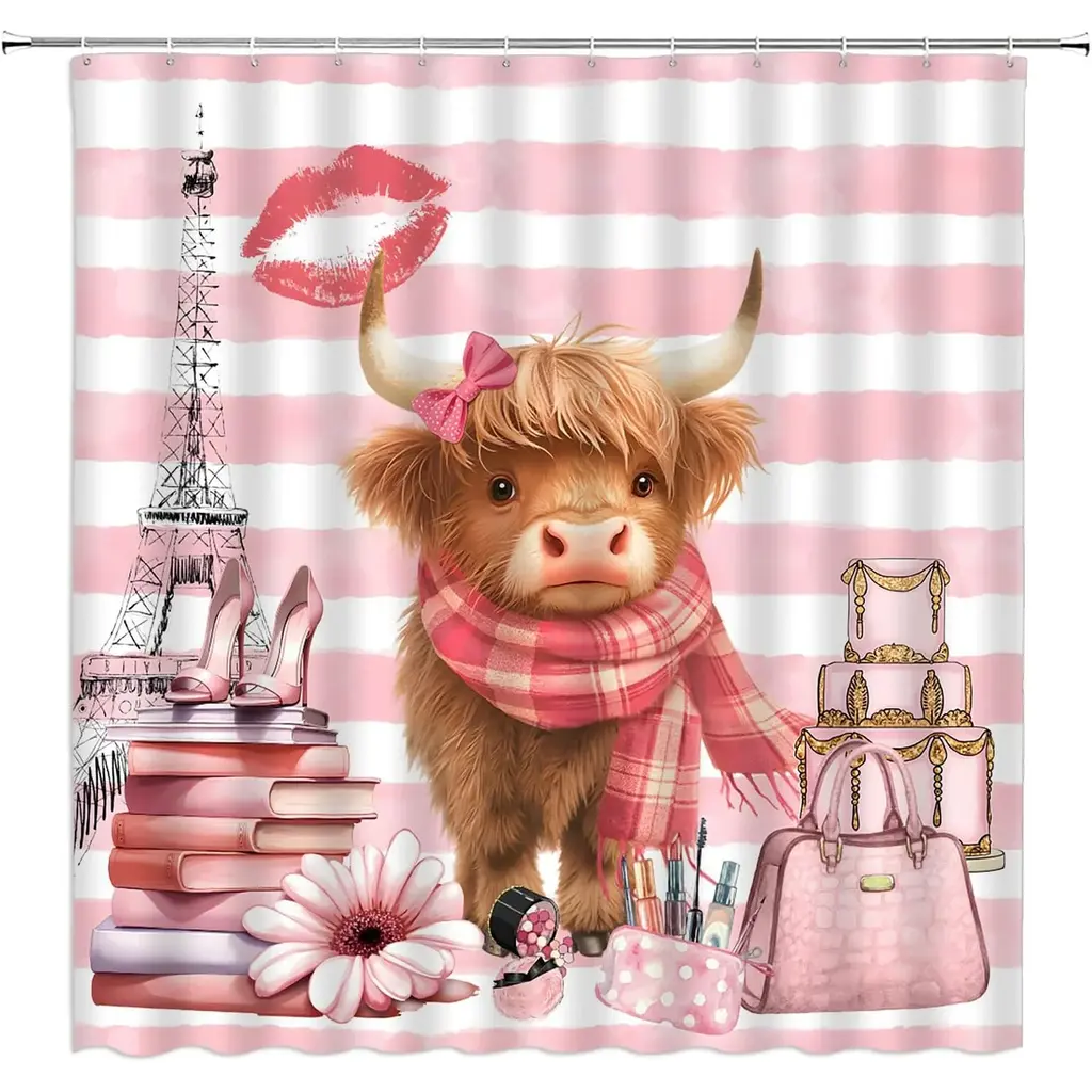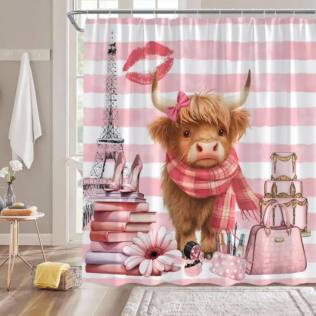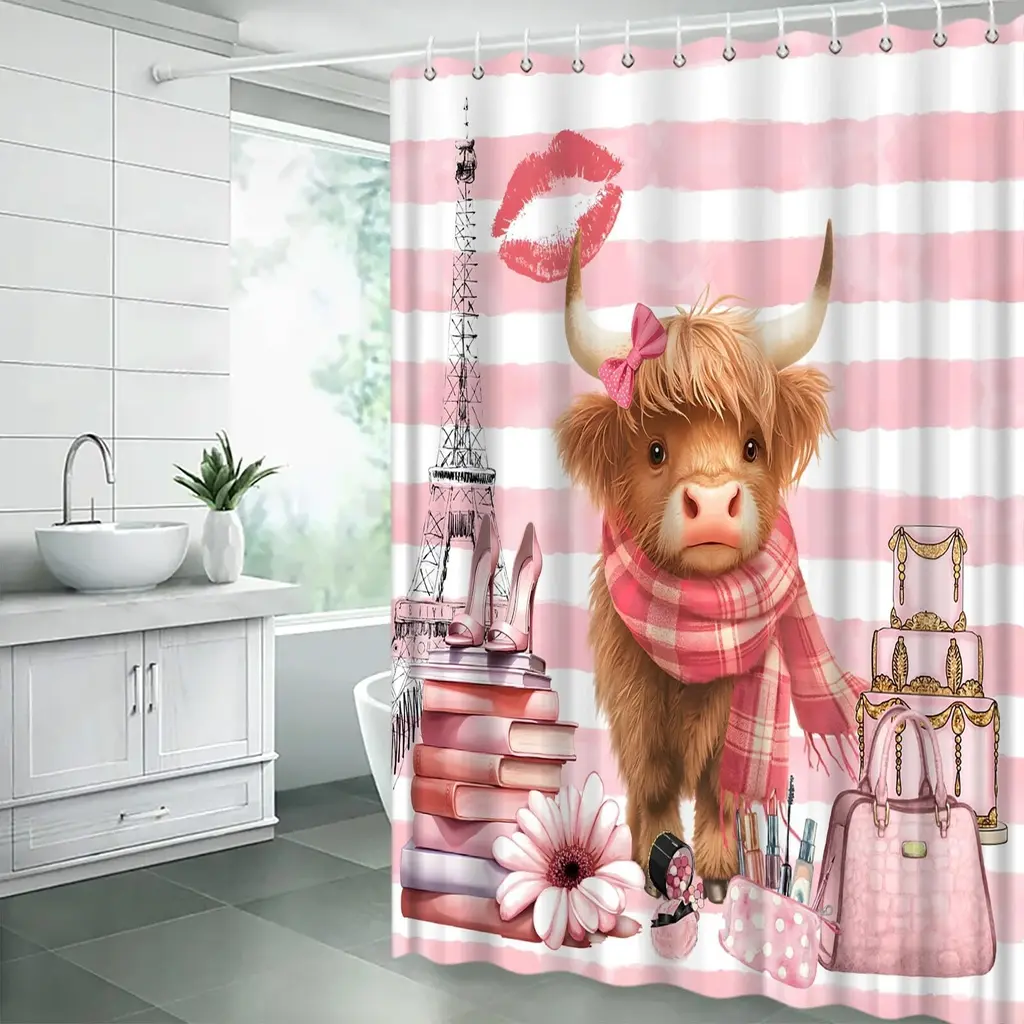 Cute Cow Shower Curtain 70" X 70" Funny Highland Cow Pink Design - Multicolor