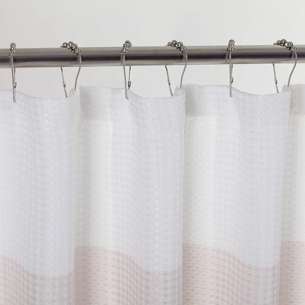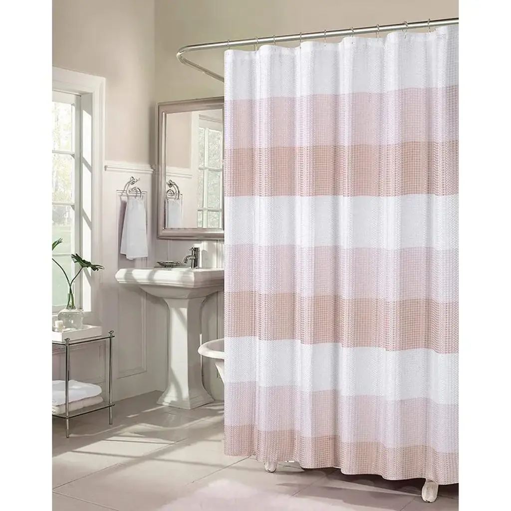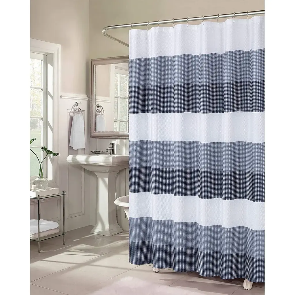 Transform the look and feel of your bathroom with beautiful textured and colorful fabric shower curtains from Dainty Home. Looking for an upscale look to a simple solid - the ombre stripe design adds fashion and style while addressing your shower curtain needs. These curtains feature an attractive woven waffle weave pattern, covering shower and bathtub openings. The classic style adds an upscale look and coordinates nicely with any bathroom decor. The premium quality tight weave of the fabric and specialized construction provides these curtains with a firm, smooth texture that is made to withstand damp, moisture-rich bathroom environments. A cotton-like hand ensures a luxurious feel without holding moisture and odors like Cotton. With the ability to dry quickly, the woven micro-fiber construction is durable yet lightweight and airy enough to allow moisture to flow away without odors forming. They drape beautifully for a clean, fresh look in your bathroom and have a soft hand feel. You are creating your spa-like bathroom oasis with these luxurious honeycomb pattern shower curtains at home or while traveling. Lightweight shower curtains are perfect for any bathroom space in your apartment, camper, campus bathroom, dorm, or weekend beach house. The hotel-style-inspired weave is glamorous in any color or design you choose. Updating your shower curtain is necessary when undertaking a DIY Bathroom update or remodeling. Be sure to coordinate your bath accessories, including shower curtains, bath towels, bath rugs, paint, and more. Going off to college - don't forget your new waffle weave shower curtain by Dainty Home. The waffle weave ombre shower curtain is perfect for adult or children's bathrooms - a unisex ombre stripe is perfect for anyone looking to update their bathroom style.Key Features of Dainty Home Hotel Collection Shower Curtains: Shower Curtain Panel Size: 70 inches wide x 72 inches long (size might vary slightly). Weave Textured Waffle Weave. Pattern: Often used in luxury robes and towels, the waffle pattern creates a textured design on the fabric that looks like a honeycomb in nature. The waffle weave also allows air to flow through the material for quick drying. The surface texture looks like a culinary waffle, hence the name—style: Luxury hotel-inspired style and design. Waterproof: The shower curtain is NOT waterproof. Construction: Machine-woven polyester with waffle weave texture. Origin: China. Care Instructions: Easy-care machine washes in cold water as needed, tumble dry low on cool, and do not bleach.