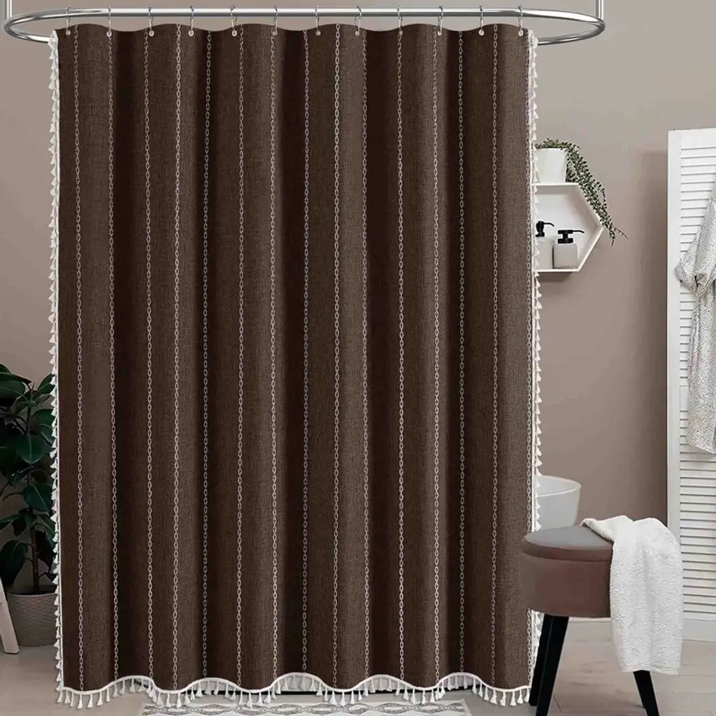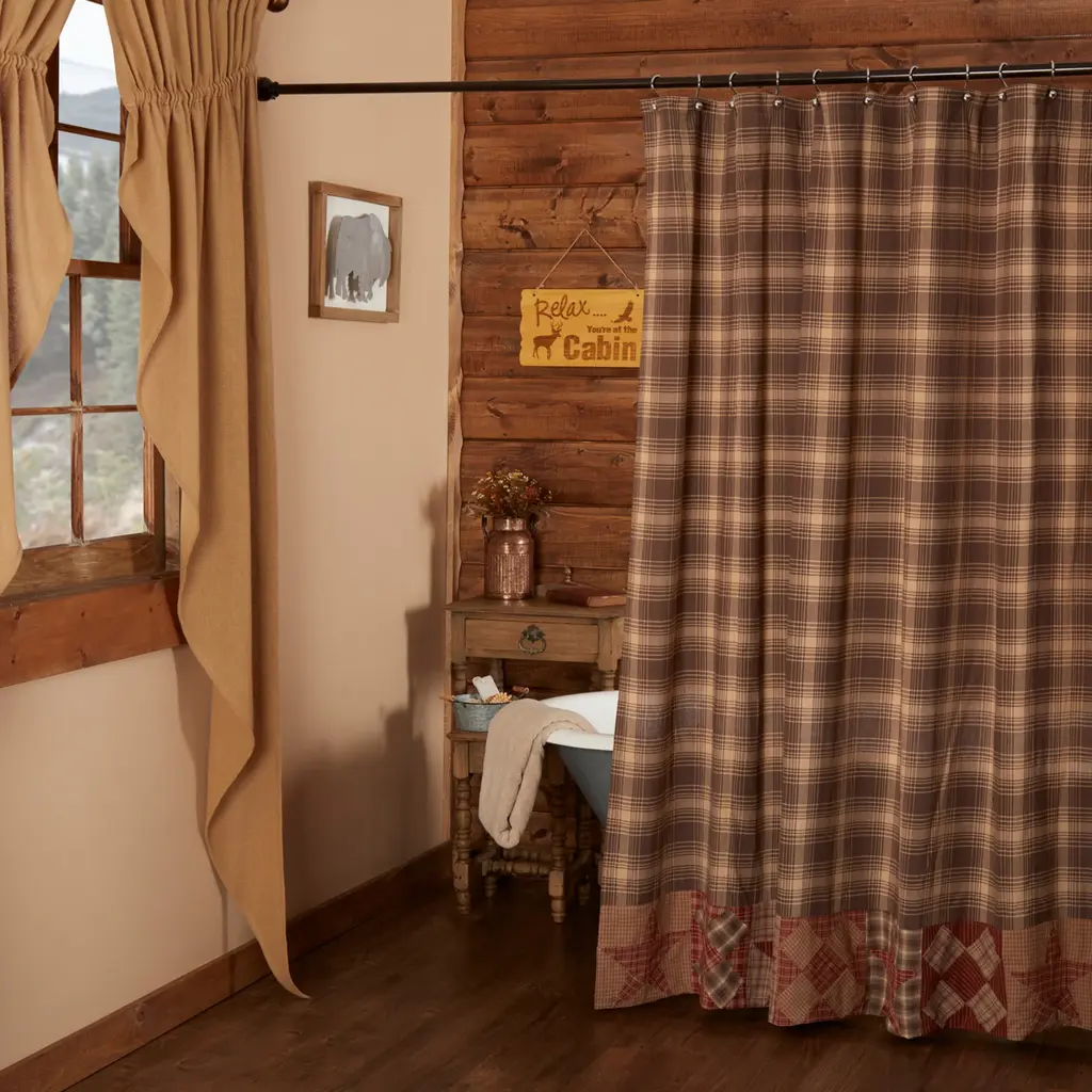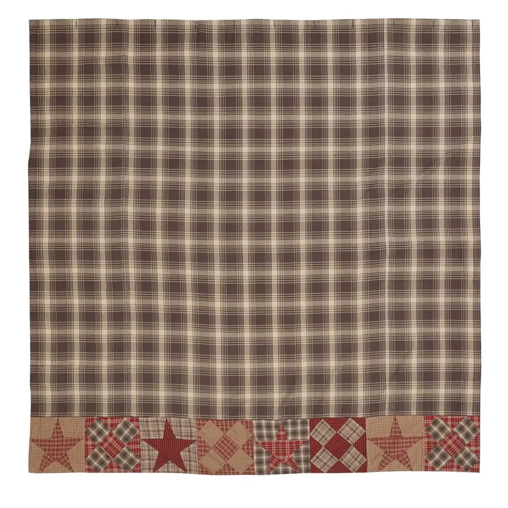 The Dawson Star Patchwork Shower Curtain fully encompasses vintage lodge decor. Constructed completely from soft cotton and bursting with rustic color featuring a dark woodland brown and tan plaid, this 72x72 shower curtain provides a relaxed, old western touch to your bath area. The quilted edge in burgundy, tan, and brown alternates five-point stars and five patch blocks. A rod pocket and button holes for shower hooks are included for convenience.Features PREMIUM CONSTRUCTION: with over two decades experience crafting goods for American homes, our items are built to last for years to come.RUSTIC DECOR: cabin style to fit any lodge, cabin, lake house, or retreat.QUALITY MATERIAL: made with durable 100% cotton for a proper look and feel.EASY CARE: machine washable for simple and hassle free cleaning.TRADITIONAL PATCHWORK: modeled after American decorating themes, a patchwork design adds heirloom appeal.EASY HANGING: has a rod pocket for simple hanging and button holes for shower hooksHem foldFeatures 1.5" header with 1" button holes and 3" rod pocketPatchwork: Machine stitched, Machine piecedSpecifications Material: 100% Cotton, Cotton LiningDimensions: 72" x 72"Weight: 1.3 lbColors: Woodland Brown, Khaki, BurgundyHanging Method: 3" Rod PocketManufacturer Country: IndiaCare: Machine Wash, Tumble Dry Low, Iron safe