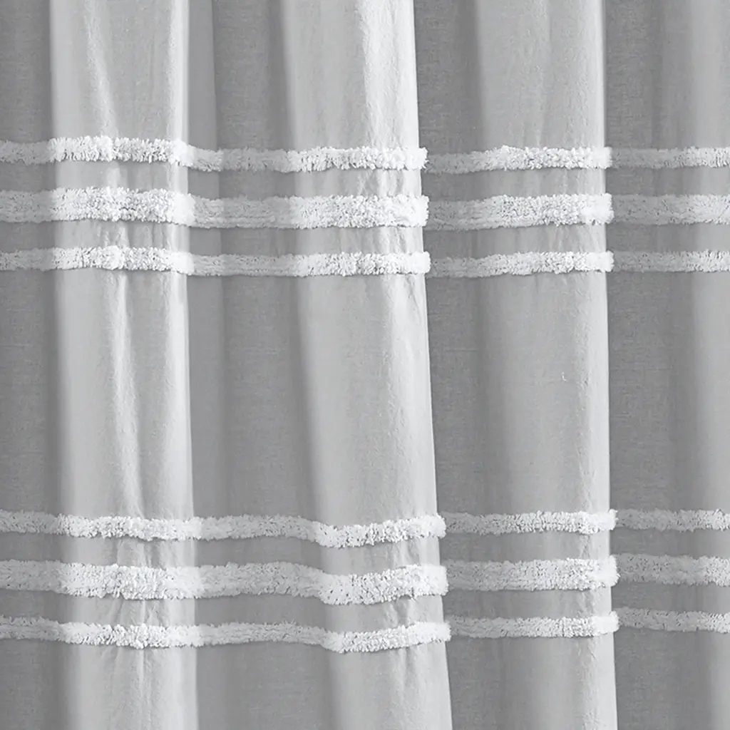 Refresh your personal sanctuary with a modern take on a classic technique presented in the DKNY Chenille Stripe Shower Curtain. A horizontal white chenille stripe offers texture on a soft ground that gives a crisp presentation to this shower curtain. With a standard 72'' x 72'' size, this shower curtain will be the perfect addition in most bathrooms. • 100% cotton • 72'' x 72'' • White or grey • Made in India