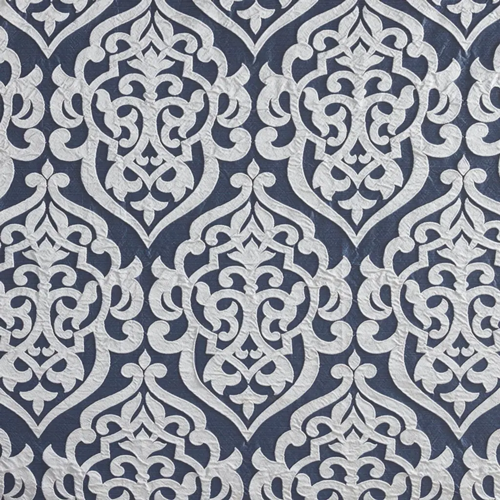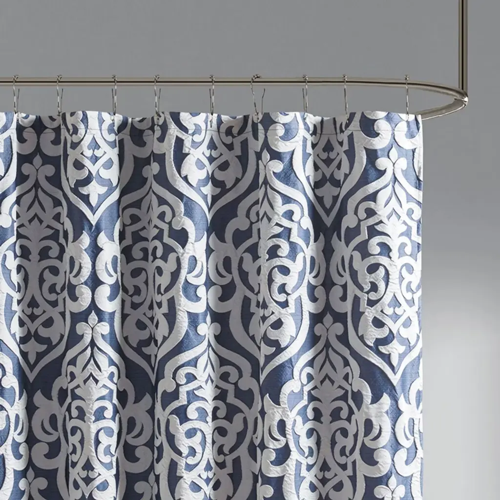 Add a touch of class to your bathroom with our Madison Park Odette Jacquard Shower Curtain. This luxurious textured shower curtain flaunts a gorgeous silver damask medallion design on a stria navy jacquard ground that adds rich texture and dimension to the lavish look. Measuring 72x72", each shower curtain is finished with 12 button holes on top making it easy to assemble hooks and hang onto rod (hooks and rod not included). To better preserve this beautiful shower curtain, a water repellant liner is highly recommended and can be purchased separately (liner not included). Machine washable for easy care; complete the collection with coordinate matching bedding, alas available and sold separately.