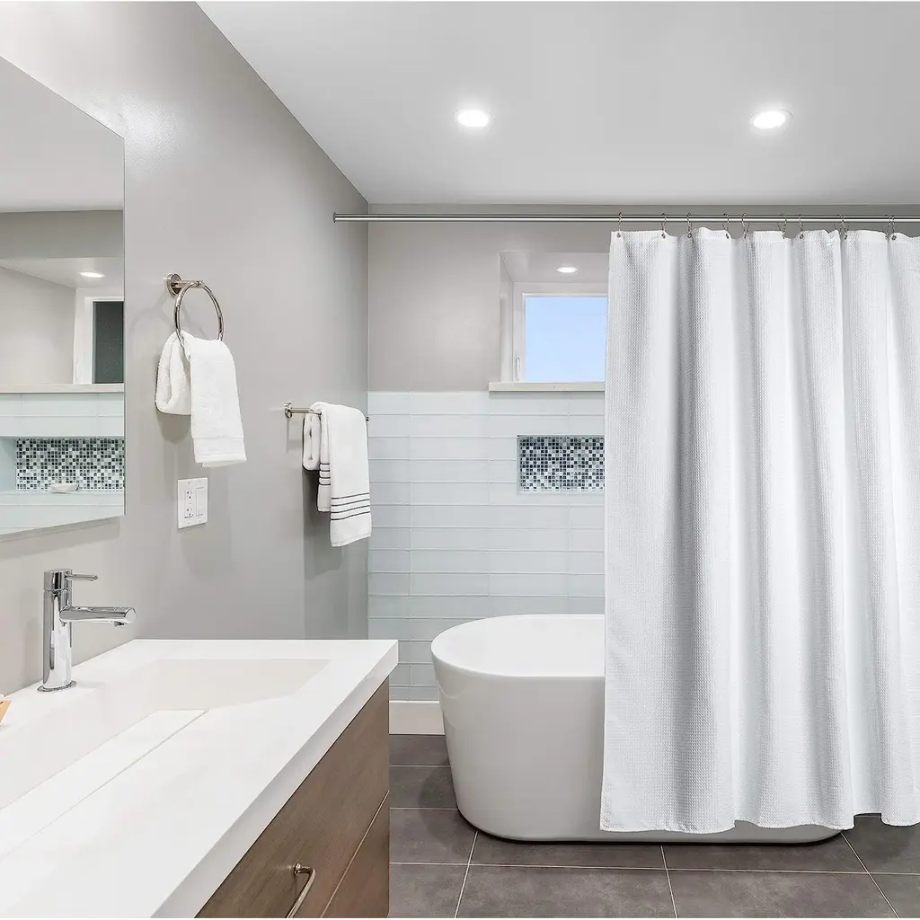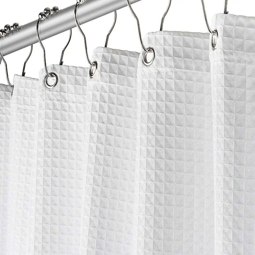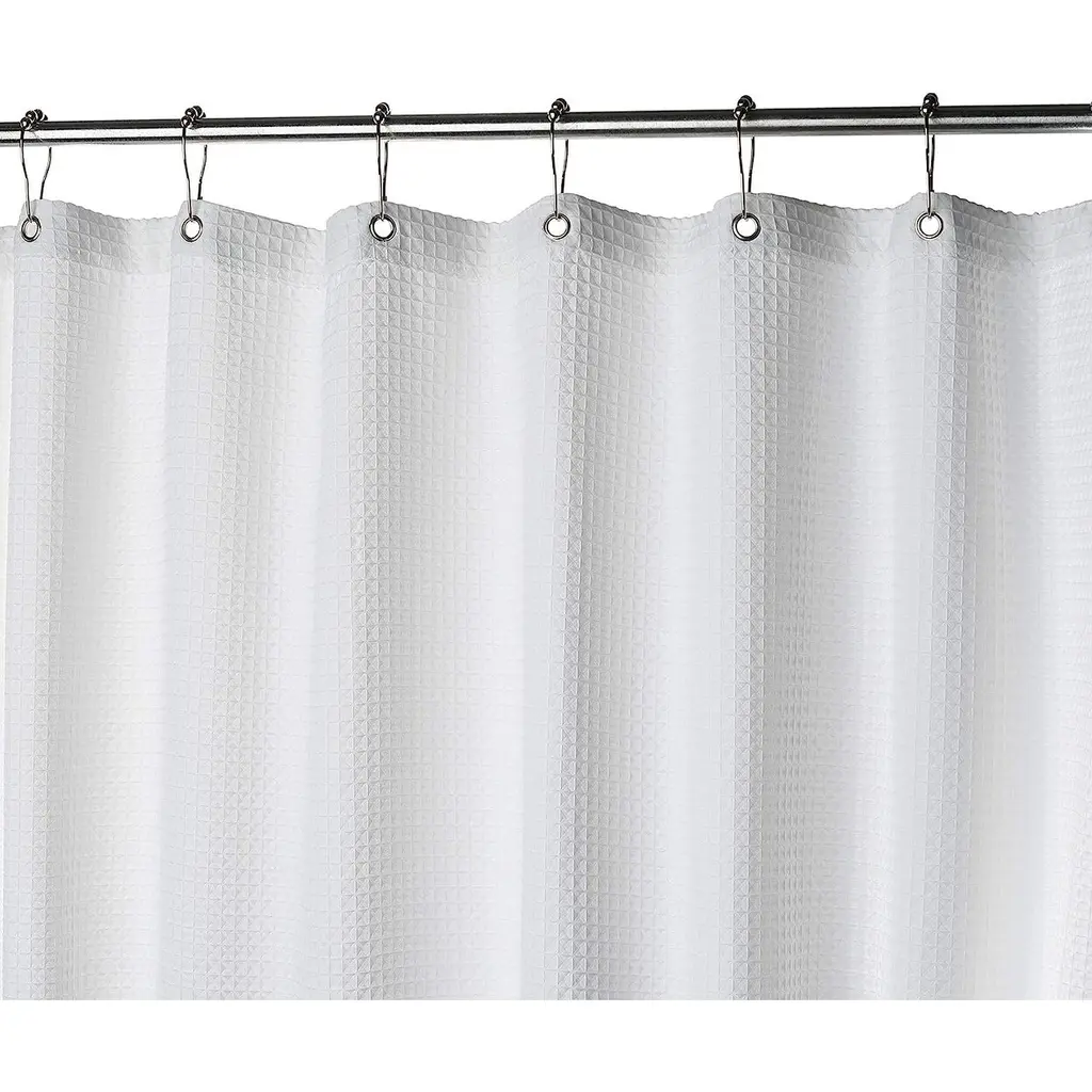 Elegant Design: Give Your Bathroom A Clean Feel with This Cloth White Shower Curtain Fabric, Rustproof Metal Grommets ★Hooks Shown Are Not Included★ Water Resistant: A Water-Resistant Waffle Weave Design Keeps Your Fabric Shower Curtain White Clean and Dry. Designed to Last: Our Bathroom Shower Curtains Feature 230 GSM Heavy-Duty Fabric and Strong Metal Rust-Free Grommets Soft Touch Cloth and Comfortable Cotton Feeling, Environmentally Friendly. Easy Care: This Soft And PVC-Free Machine Washable Hotel Shower Curtain Takes the Pain Out of Clean-Up, Just Wash It in Cold Water, Do Not Bleach, Use Mild Detergent, Tumble Dry Low. 100% Satisfaction: Upgrade Your Bathroom with A Durable and Decorative Modern Shower Curtain Measures 72 X 72 Inches to Fit Standard Size Shower / Bathtub Risk-Free!