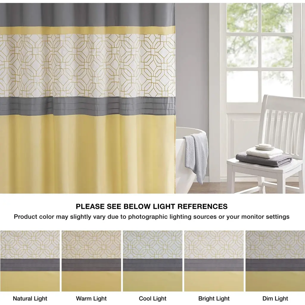 Easily transition your bathroom with this simple, yet beautifully classic shower curtain. The faux silk dupioni fabric has a natural light sheen and drapes beautifully, while also machine washable for easy care. This lightweight shower curtain features pieced and pintucking details creating a rich texture and a unique color block design, sure to freshen up any space. Pattern layout may vary due to variation of sizes. A water repellant liner is not included, and highly recommended. Complete the collection and look with coordinate bath decor, bedding, and window decor - available and sold separately.Product Details72x72"1 Shower Curtain:72x72"Material100% polyester faux silk
