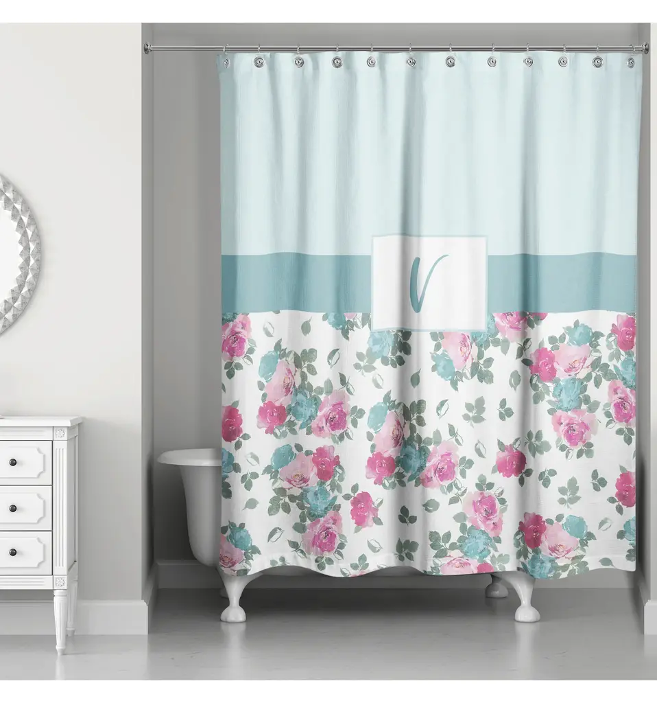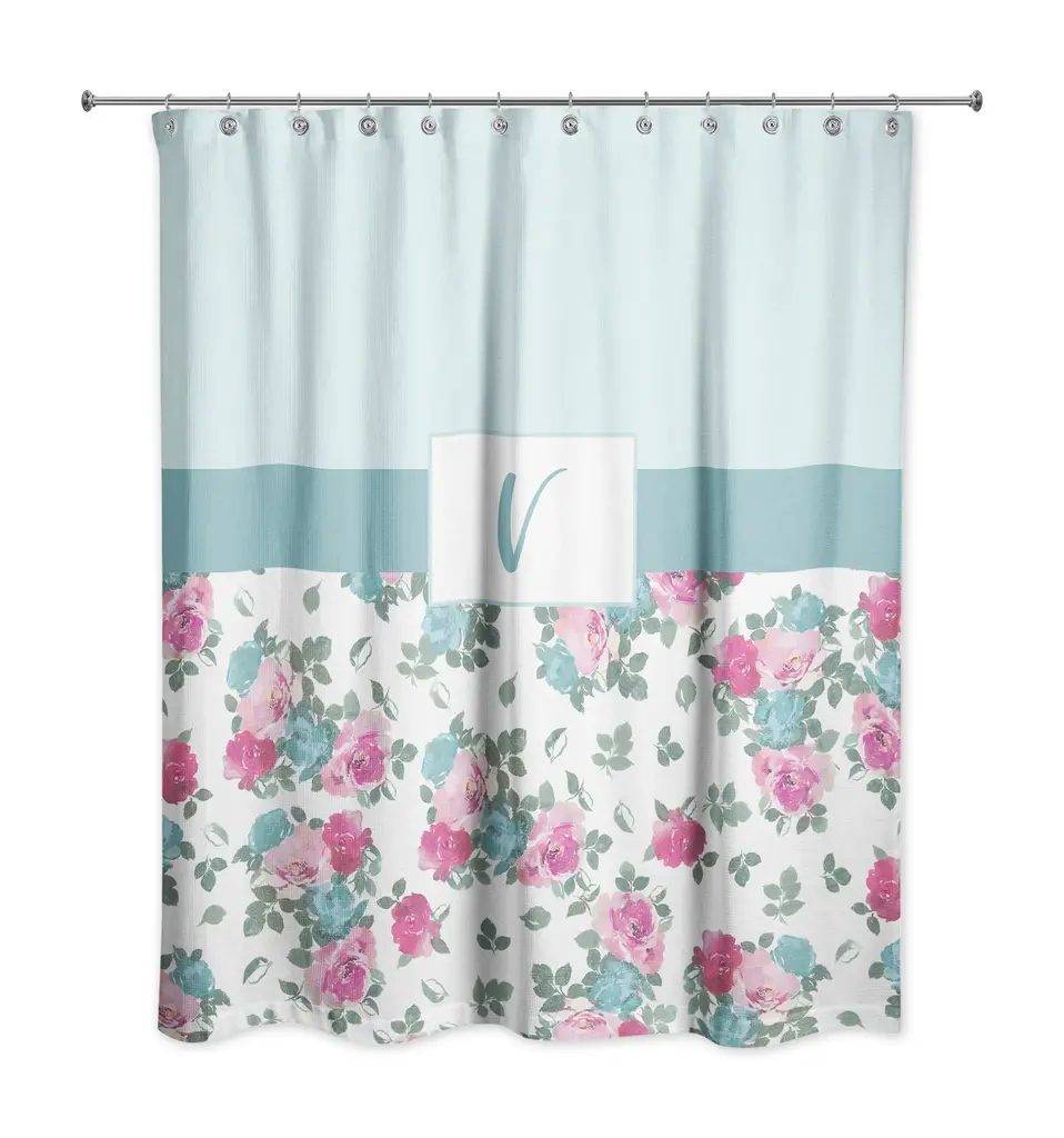 Personalize your bathroom with this beautiful floral print monogrammed shower curtain. The Floral Monogram Shower Curtain from Designs Direct features a blue and pink floral print with the letter V monogram in a script font. The shades of light blue, pink, green and white will brighten up and add elegance to any bathroom.100% softened polyesterMeasures 71" L x 74" WStandard size with 12 stitch-enforced eyelets for hangingShower rod, rings, or liner not includedMade in USA of imported materialsPersonalized with initialed monogramCare Instructions: Machine Wash Separately in Cold Water, Delicate Cycle, Do Not Bleach, Tumble Dry Low, Press with Low Heat Shower curtains are made stitched enforced eyelits for hanging. Grommets, hooks and rod are not included.