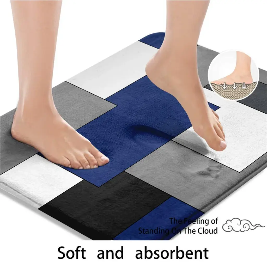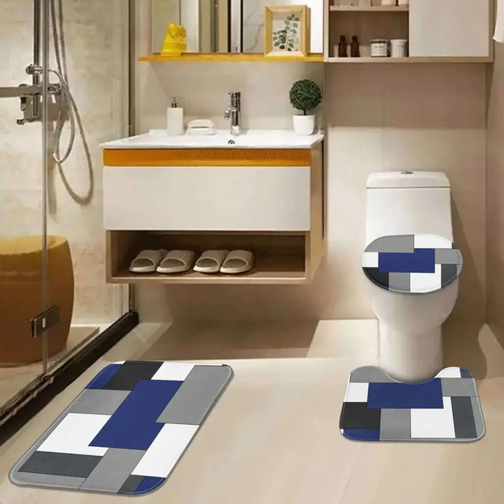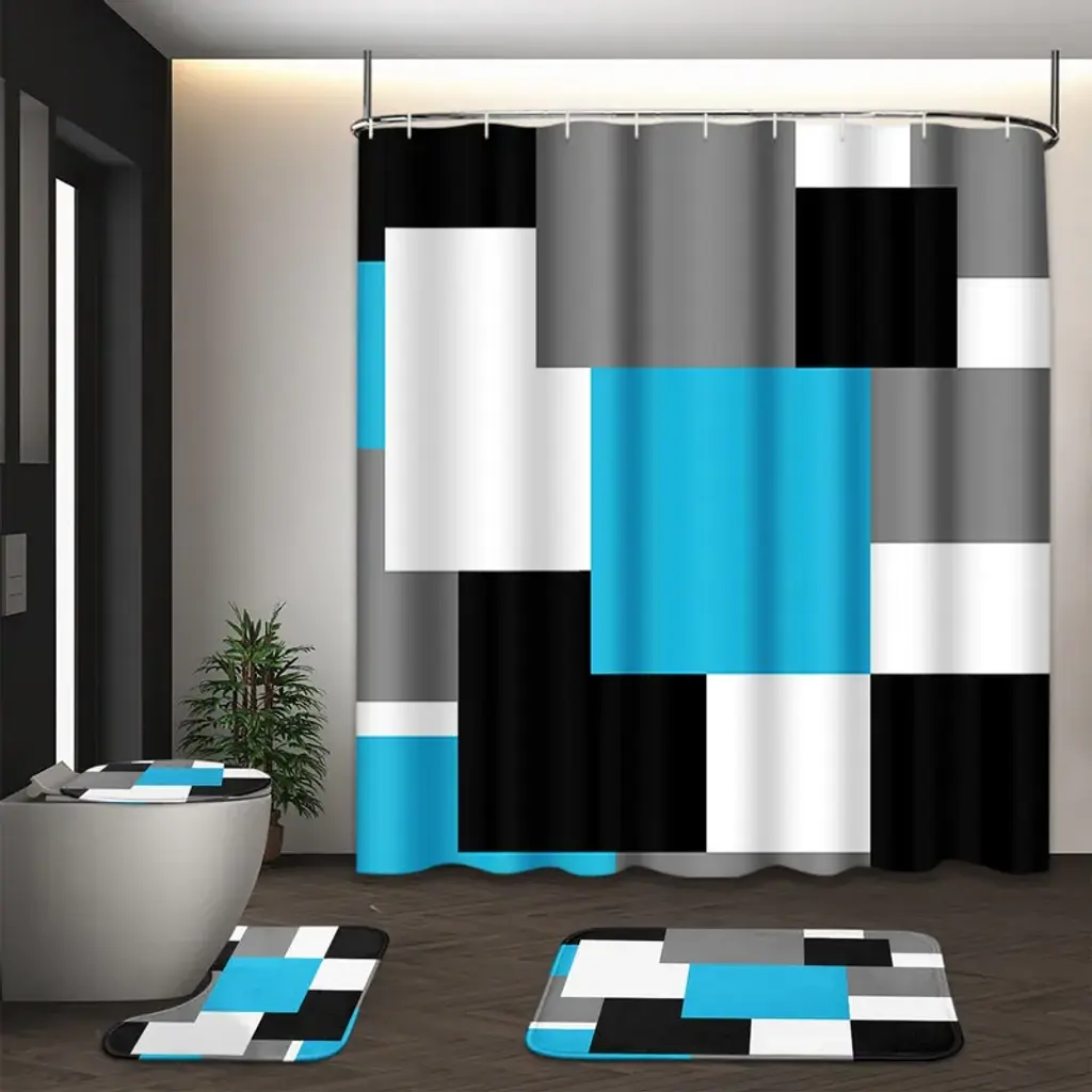 Geometric Shower Curtain Set With Toilet Lid Cover And Non Slip Rugs - Abstract Geometric Dark Blue