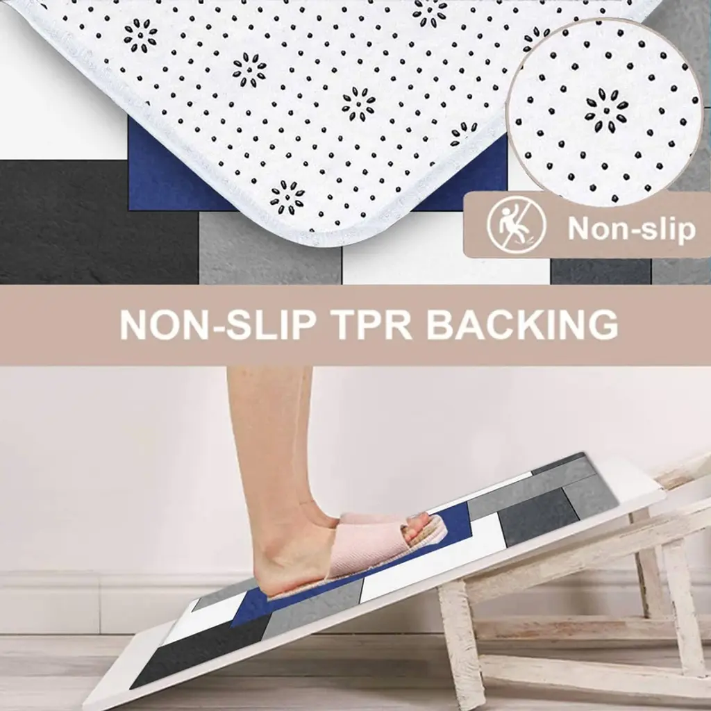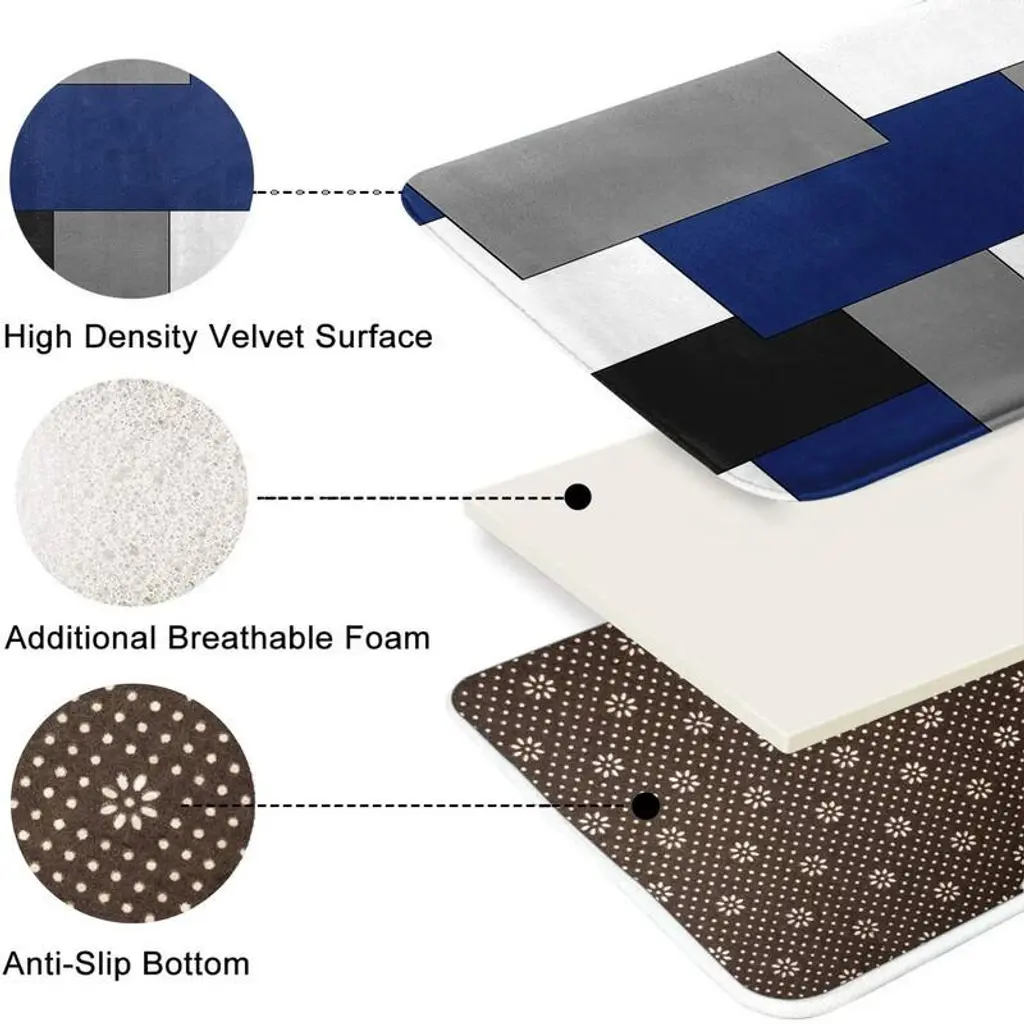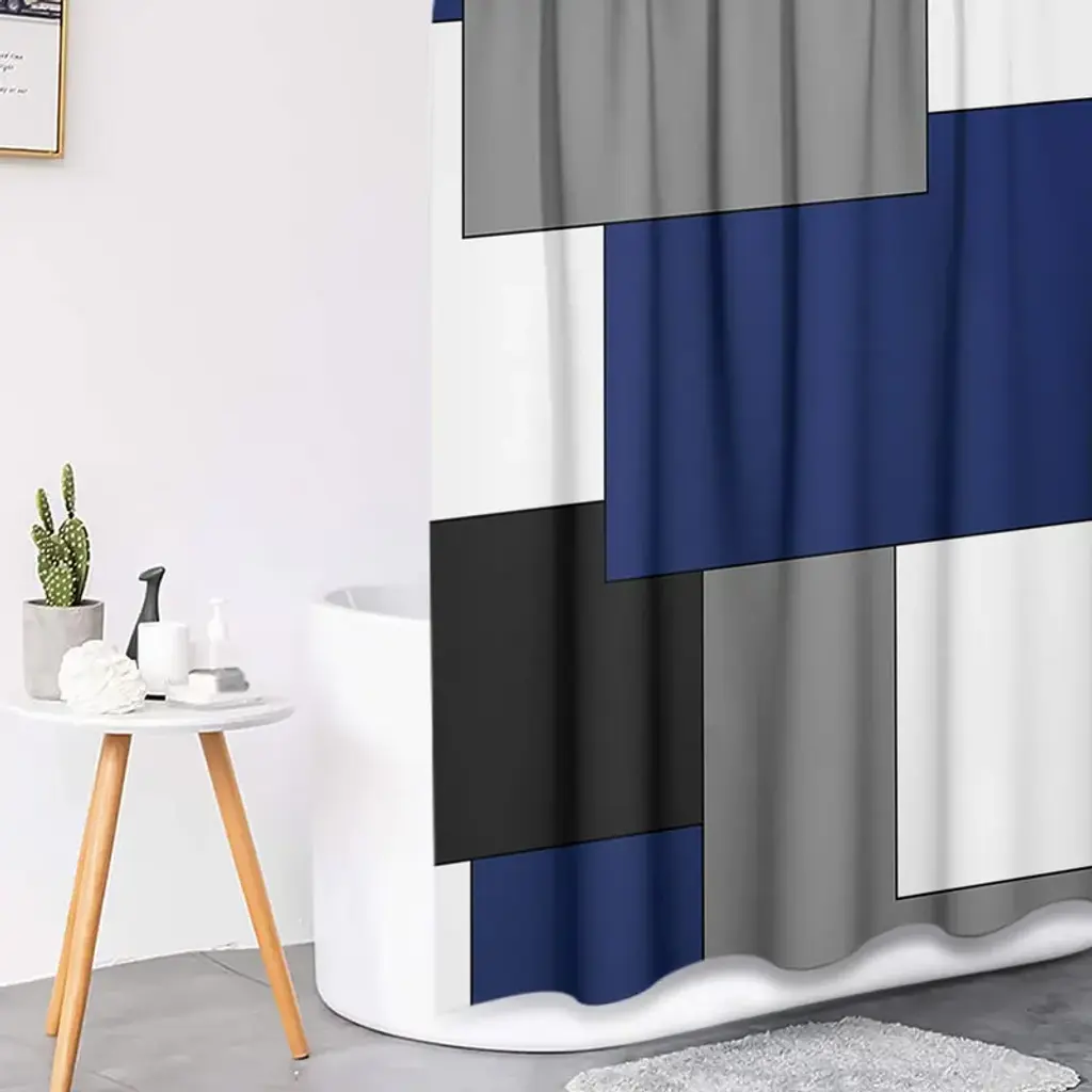 Polyester Size: The navy blue geometric shower curtain 72 "Lx72" W, thickened bathroom mat 29.5 "Lx17.7" W, o-toilet cover: 17.5 "Lx" 14.6 "W, U-shaped carpet: 17.7" Lx15.7 "wide. Comfortable Bathroom Experience: The navy blue geometric bathroom set uses high-definition pattern printing technology, rich in colors and vivid, Not easy to fade. Change your bathroom style and create a warm and comfortable bathroom experience. Bathroom Decor: Navy Blue geometric shower curtain set is made of good quality polyester fabric, waterproof and durable. The bath mat/U type rug made from soft flannel, feature skid-resistant backing, non-slip and durable. Easy to Use: We gift 12 easy hang and slide strong hooks for you. You don't have to worry about how to install it. Wash Attention: Hand wash or machine wash with cold water, hang to dry, iron at low temperatures, please don't expose to the sun, do not bleach.