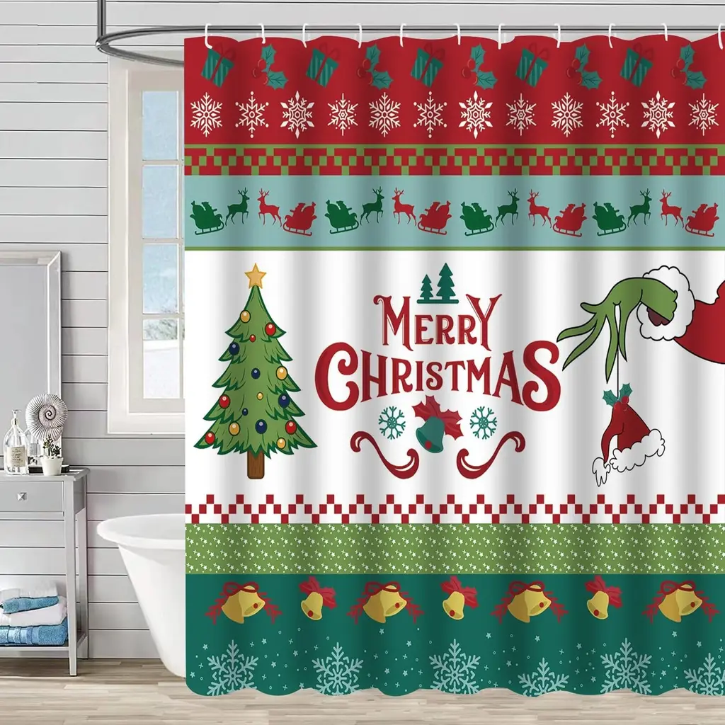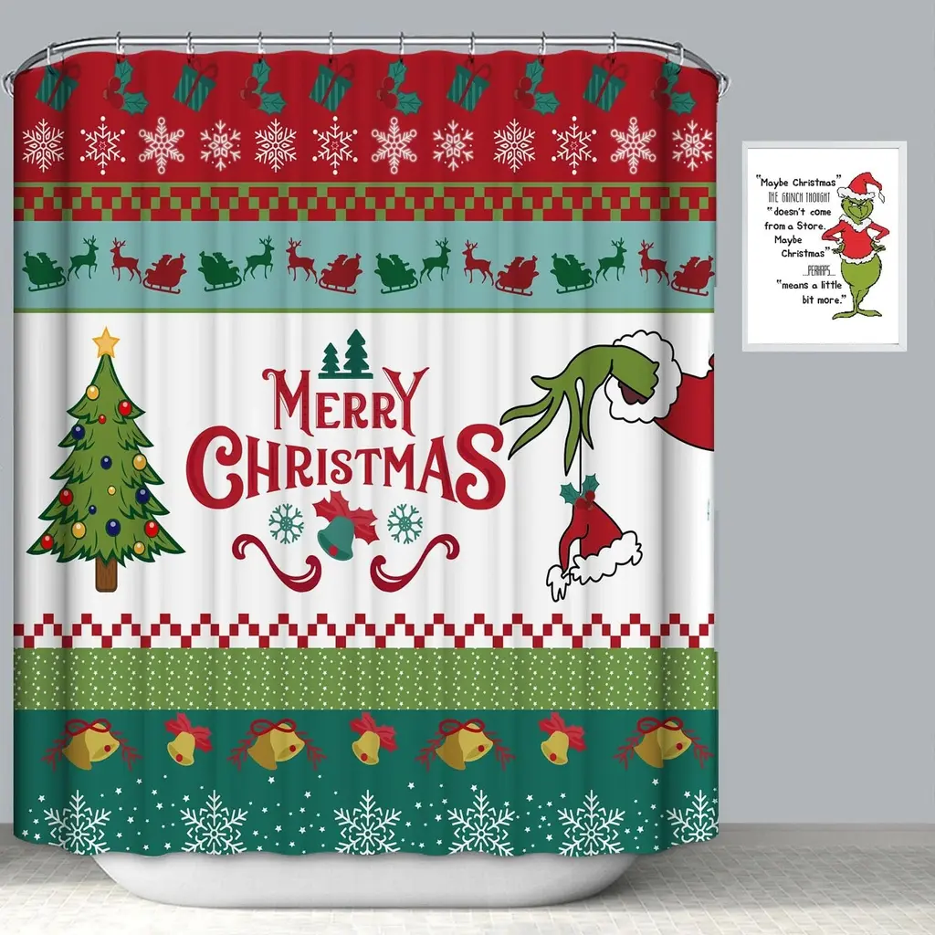 Spread holiday cheer with our Grinch Merry Christmas Shower Curtain, featuring a playful design in vibrant red and green. Measuring 72" x 72", this fun curtain showcases the iconic Grinch, bringing a whimsical touch to your bathroom decor. Crafted from high-quality, water-resistant fabric, it offers durability and easy cleaning, making it perfect for everyday use during the festive season. The bold colors and cheerful imagery create a lively atmosphere, ensuring your space is filled with holiday spirit. Embrace the mischief and magic of Christmas with this delightful shower curtain that adds a fun flair to your holiday celebrations!