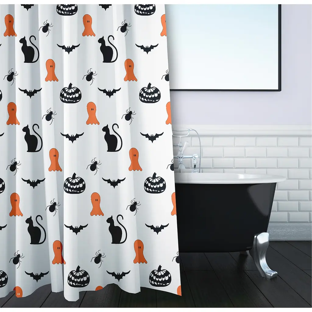 Create a festive and fun atmosphere in your home this Halloween season with our Halloween Halloween Critters Shower Curtain from the Witches Brew Collection. This durable and decorative polyester fabric shower curtain has a single sided design and a buttonhole top to easily refresh your bath for each season. It is made of 100% polyester that is quick drying. When it needs to be washed, just toss it into your washing machine, and then tumble dry. You will love the fun and style brought to your bath space by this decorative shower curtain! The quirky designs in this collection are the perfect way to enhance your fall decor and to bring a smile to all who encounter them.