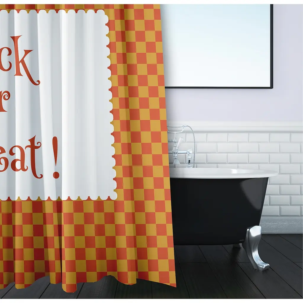 Create a festive and fun atmosphere in your home this Halloween season with our Halloween Trick or Treat Checks Shower Curtain from the Witches Brew Collection. This durable and decorative polyester fabric shower curtain has a single sided design and a buttonhole top to easily refresh your bath for each season. It is made of 100% polyester that is quick drying. When it needs to be washed, just toss it into your washing machine, and then tumble dry. You will love the fun and style brought to your bath space by this decorative shower curtain! The quirky designs in this collection are the perfect way to enhance your fall decor and to bring a smile to all who encounter them.