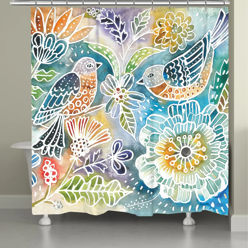 This colorful spring shower curtain, "Happy Birds," is a cheerful and joyous decor piece to add to a bathroom. A vibrant watercolor background is used to fill in the white outlined birds and floral arrangement. This shower curtain will brighten up any home.All of our products are digitally printed to create crisp, vibrant colors and images. Made to order in the USA on imported fabric. Please allow 5-7 days for items to ship.Artist: Lori Siebert