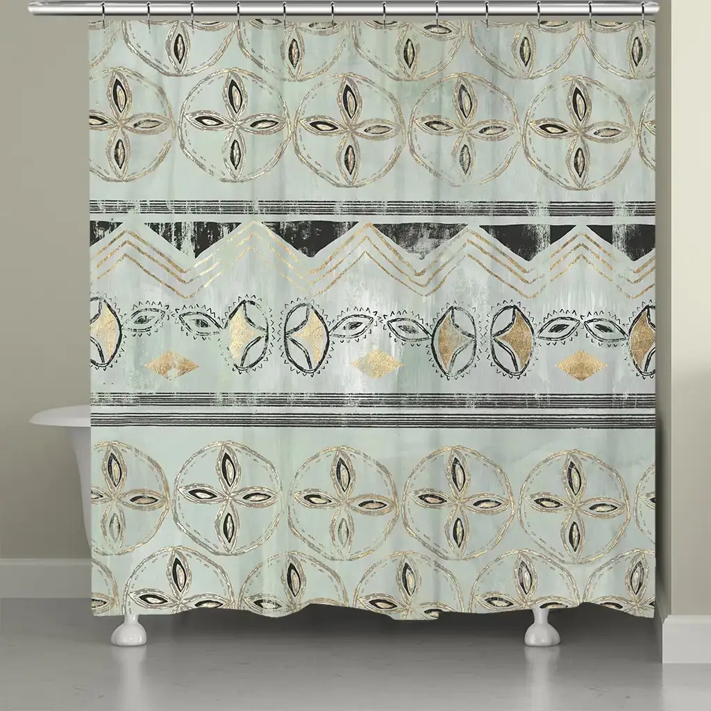 This pattern themed shower curtain, "In the Rhythm" will add a modern tribal look to any bathroom. The design features black and gold shapes lined up to create a pattern on a gray distressed backdrop. Bring a uniqueness into your home with "In the Rhythm" shower curtain!All of our products are digitally printed to create crisp, vibrant colors and images. Made to order in the USA on imported fabric. Please allow 5-7 days for items to ship.Artist: Tom Reeves