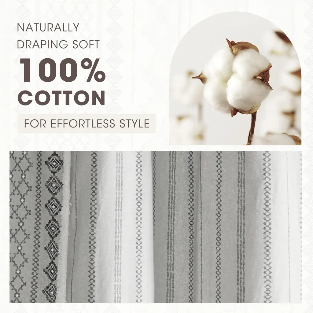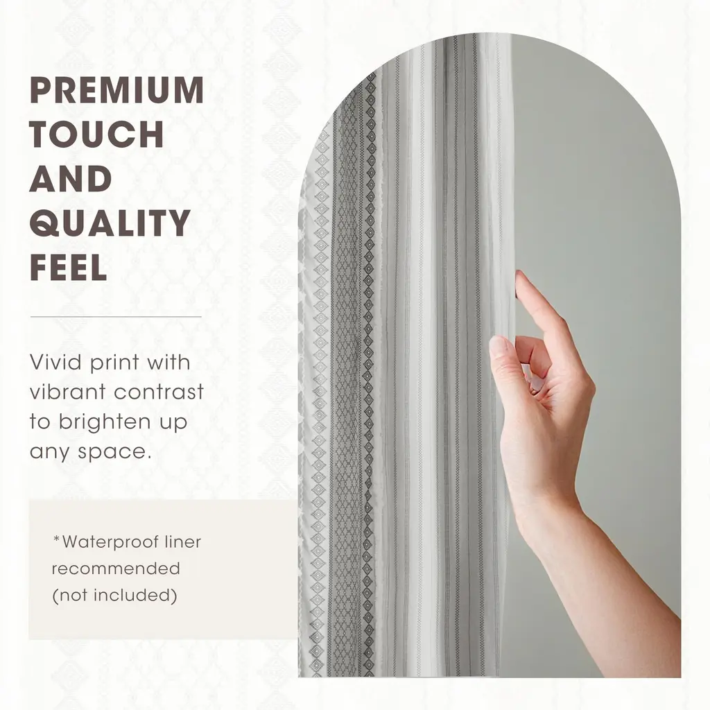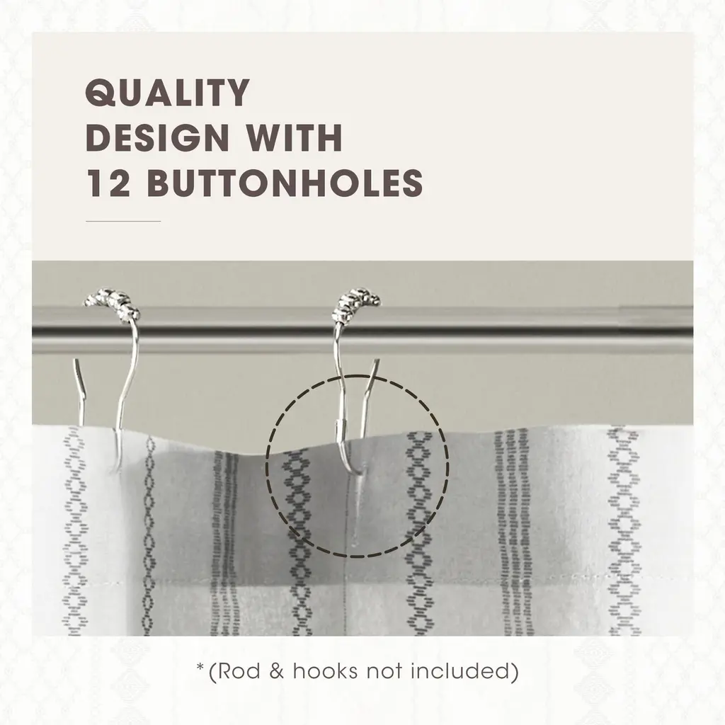 Elevate the look of your bathroom with the INK+IVY Imani Cotton Printed Shower Curtain with Chenille Stripe. This 100-percent cotton shower curtain features a globally inspired Aztec print with a cotton chenille trim that adds a sophisticated touch. Machine washable for easy care, this shower curtain is also OEKO-TEX certified meaning it does not contain any harmful substances or chemicals for the best in quality comfort and wellness. Each shower curtain measure 72x72 inches and is finished with 12 button holes at the top making it easy to hang; hooks, rod, and a water repellant liner are not included and will need to be purchased separately. Complete the look with coordinating bedding, available and sold separately. Features:Dimensions: