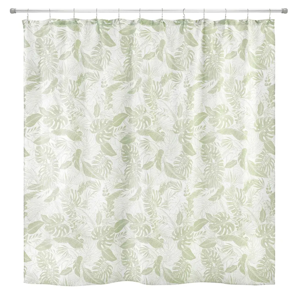 The Izod Reef Decorative Shower Curtain features a subtle, oversized, all-over tropical leaf design in light green on a white textured ground. Printed on 100% polyester for easy care and brilliant colors, 72" x 72". Coordinating accessories, shower curtain, rug, towels available.