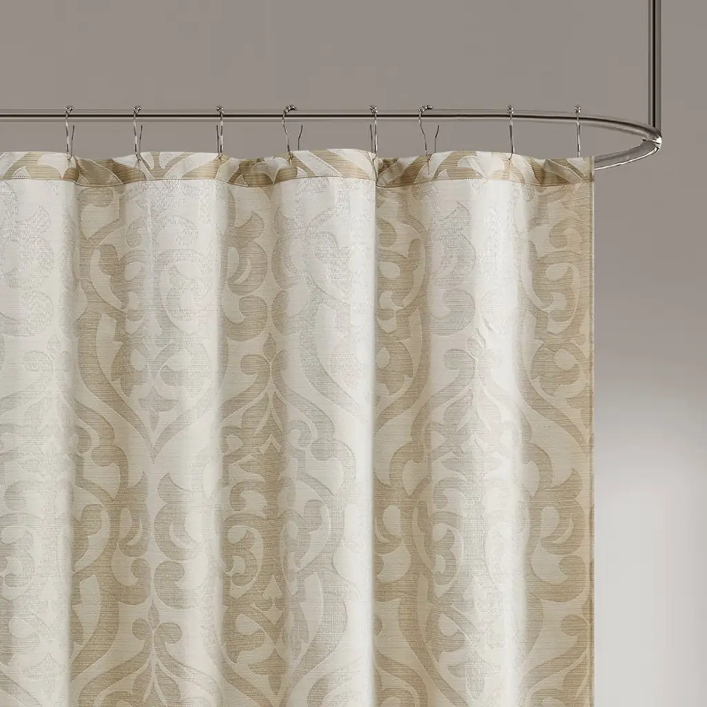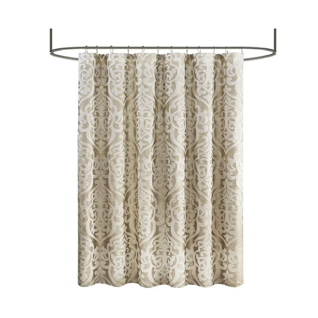 Add a touch of class to your bathroom with our Madison Park Odette Jacquard Shower Curtain. This luxurious textured shower curtain flaunts a gorgeous ivory damask medallion design on a stria tan jacquard ground that adds rich texture and dimension to the lavish look. Measuring 72x72", each shower curtain is finished with 12 button holes on top making it easy to assemble hooks and hang onto rod (hooks and rod not included). To better preserve this beautiful shower curtain, a water repellant liner is highly recommended and can be purchased separately (liner not included). Machine washable for easy care; complete the collection with coordinate matching bedding, alas available and sold separately.Product Details72x72"1 Shower Curtain:72"W x 72"LMaterial100% Polyester Jacquard