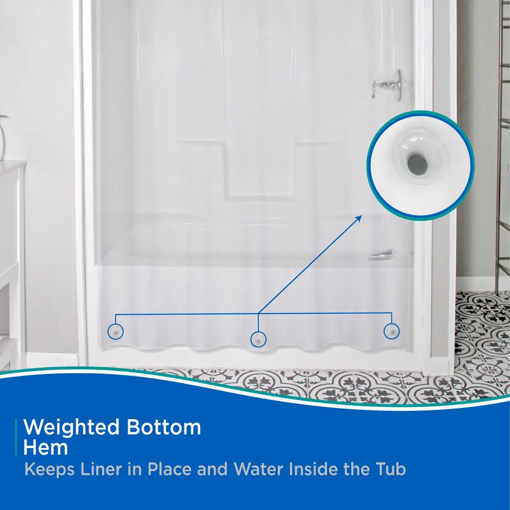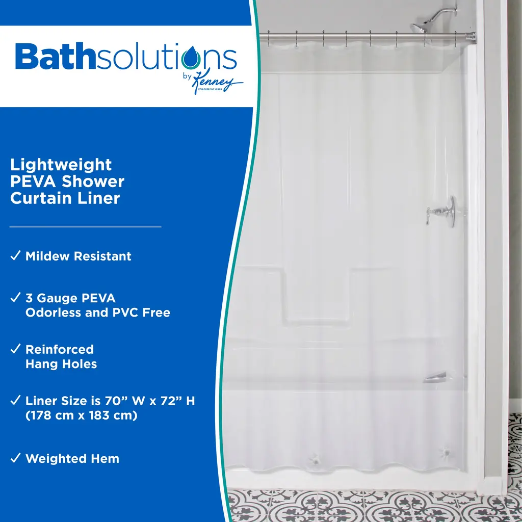 The Kenney Lightweight PEVA Shower Curtain Liner is made of environmentally friendly PEVA, making it PVC-free and odorless. The liner features 12 reinforced hang holes to prevent tearing from shower hooks and rings. The weighted hem on the waterproof liner keeps the liner in place, so water stays in your bathtub and off of the floor.Standard sized, it measures 70 inches wide by 72 inches tall (180 cm x 183 cm) to fit most showers and bath tubs.