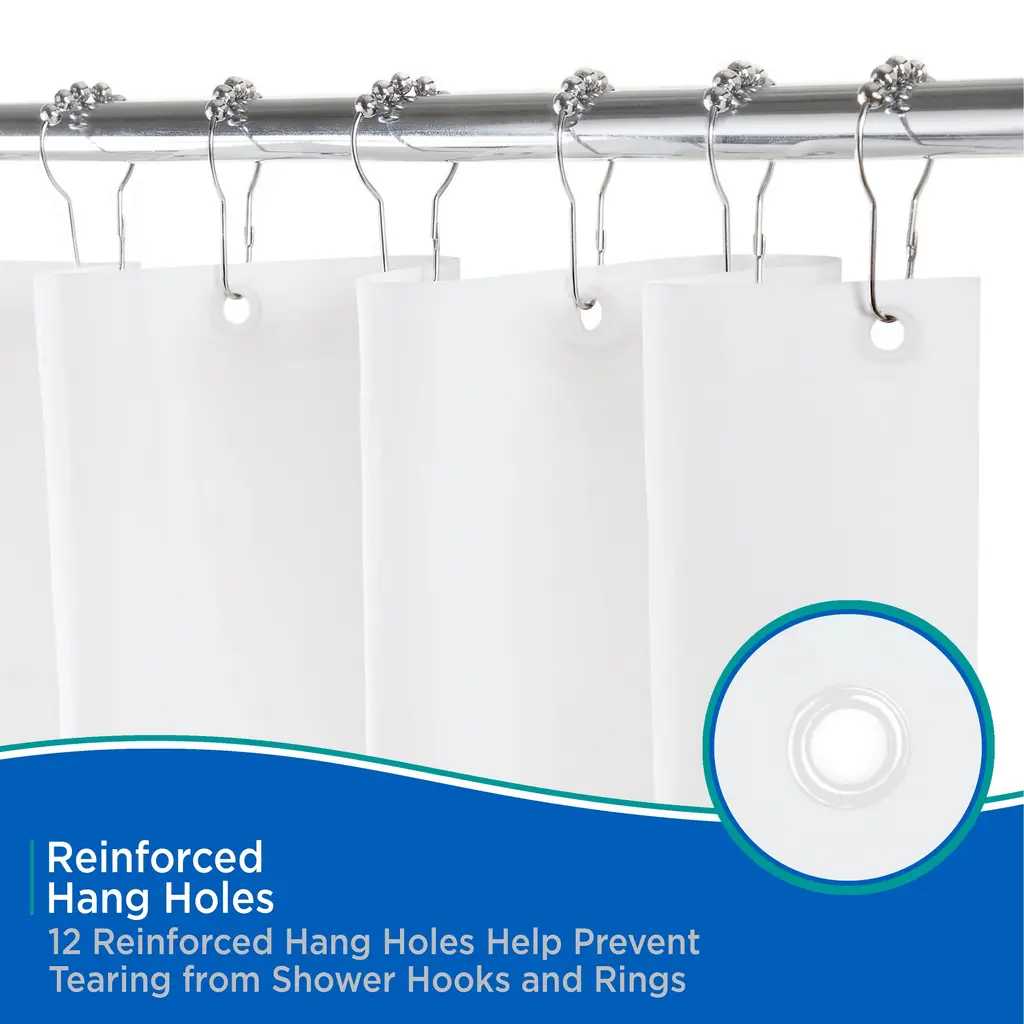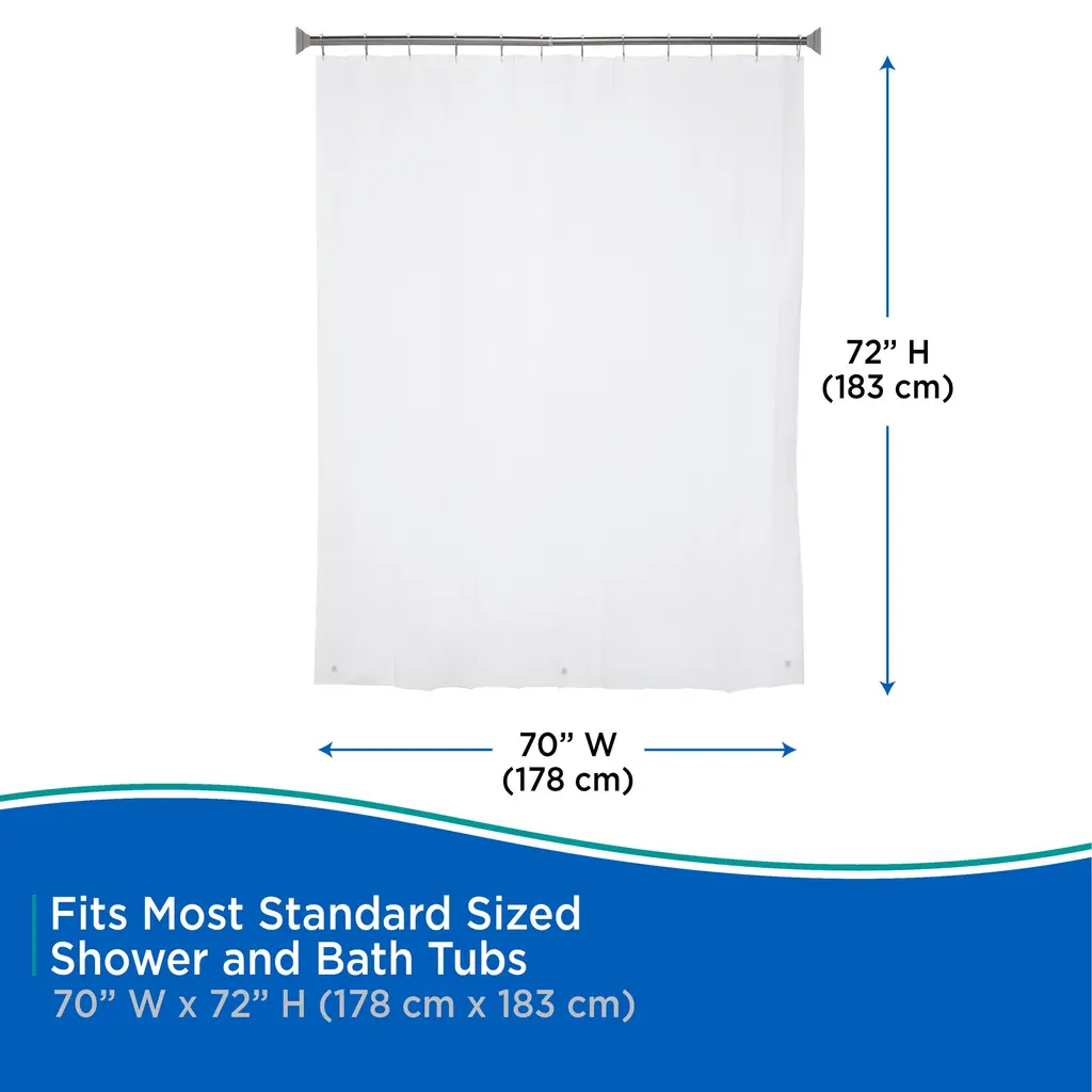 The Kenney Lightweight PEVA Shower Curtain Liner is made of environmentally friendly PEVA, making it PVC-free and odorless. The liner features 12 reinforced hang holes to prevent tearing from shower hooks and rings. The weighted hem on the waterproof liner keeps the liner in place, so water stays in your bathtub and off of the floor.Standard sized, it measures 70 inches wide by 72 inches tall (180 cm x 183 cm) to fit most showers and bath tubs.