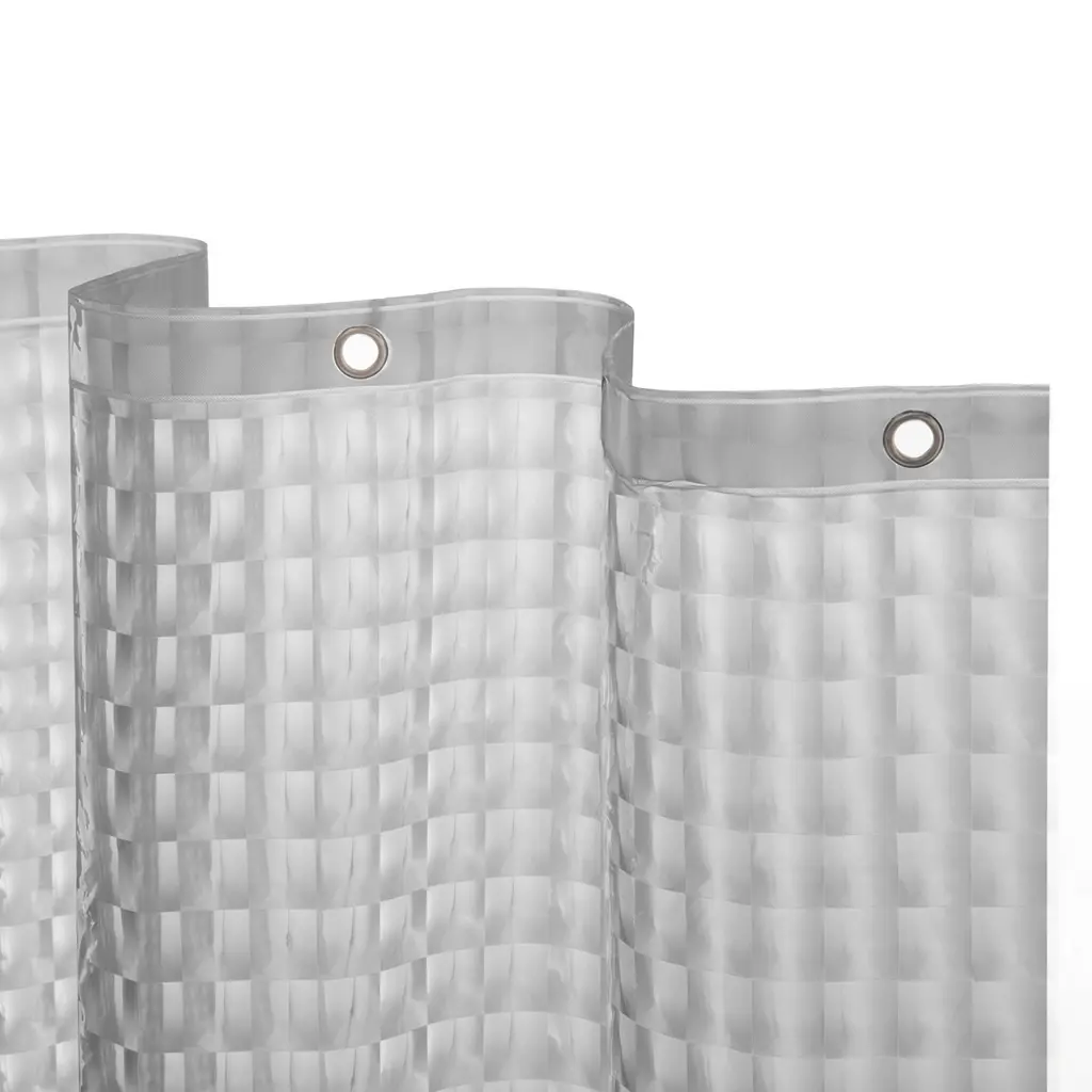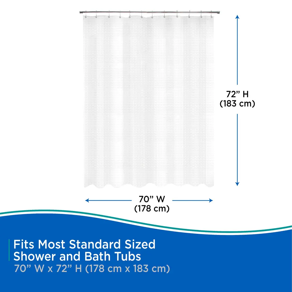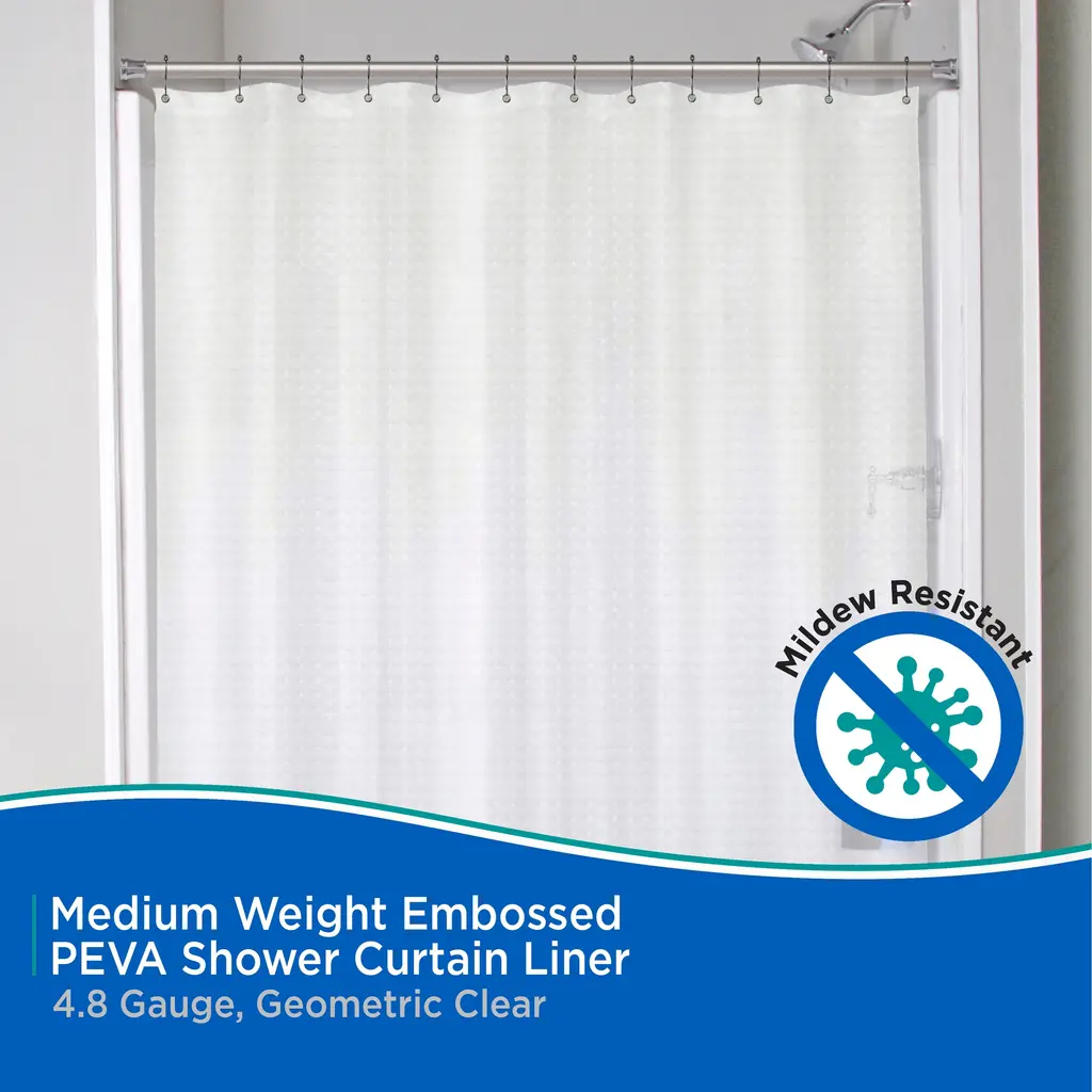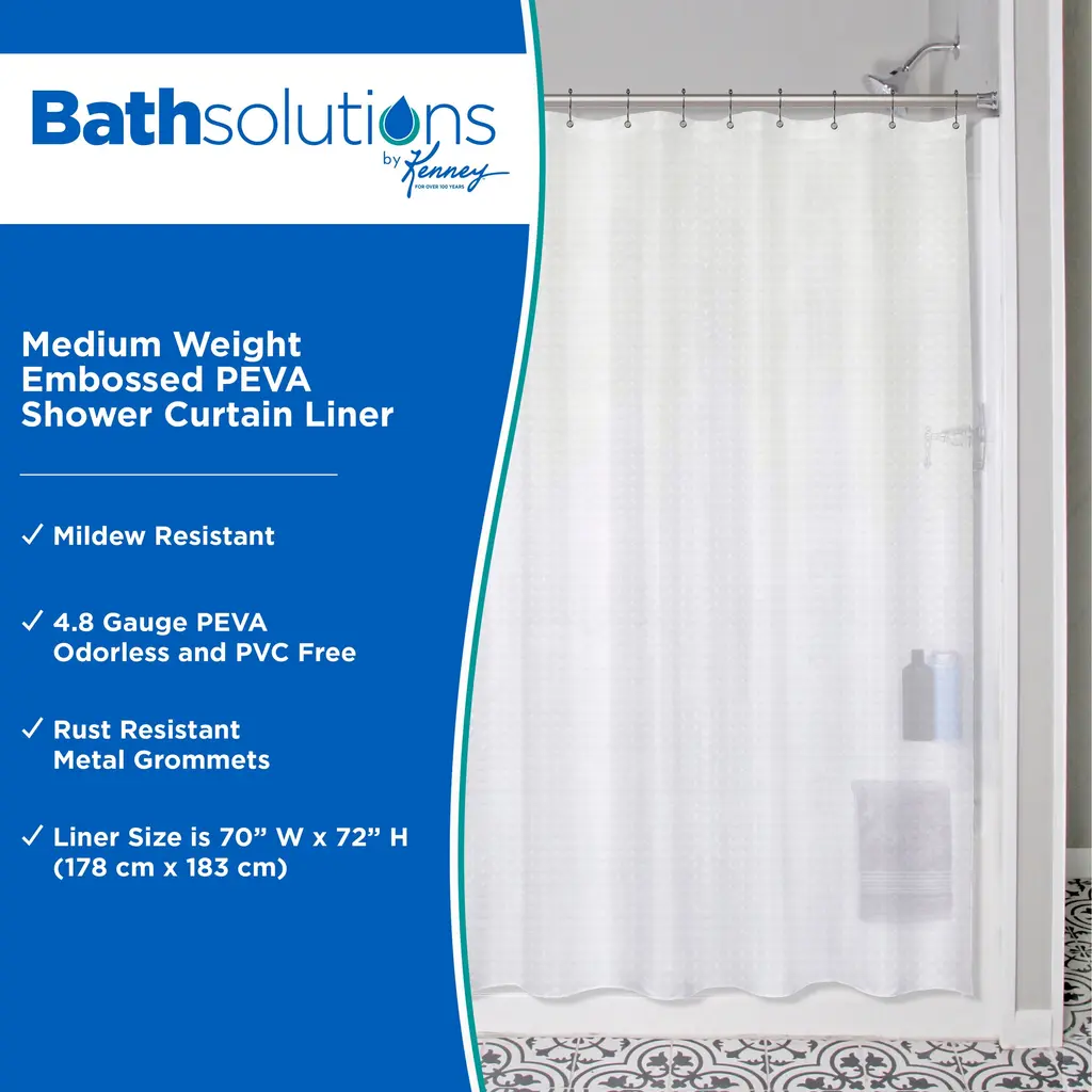Update the look of your bathroom with a Kenney Medium Weight Embossed PEVA Shower Curtain Liner. The semi-transparent liner is embossed with a geometric pattern. Use it as a stand-alone shower curtain, or as a liner with a shower curtain.Made of environmentally friendly PEVA, this medium weight bath liner is PVC-free and odorless. The liner has 12 rust-resistant metal grommet hang holes to prevent tearing from shower hooks and rings. Standard sized, it measures 70 inches wide by 72 inches tall (180 cm x 183 cm) to fit most showers and bath tubs.