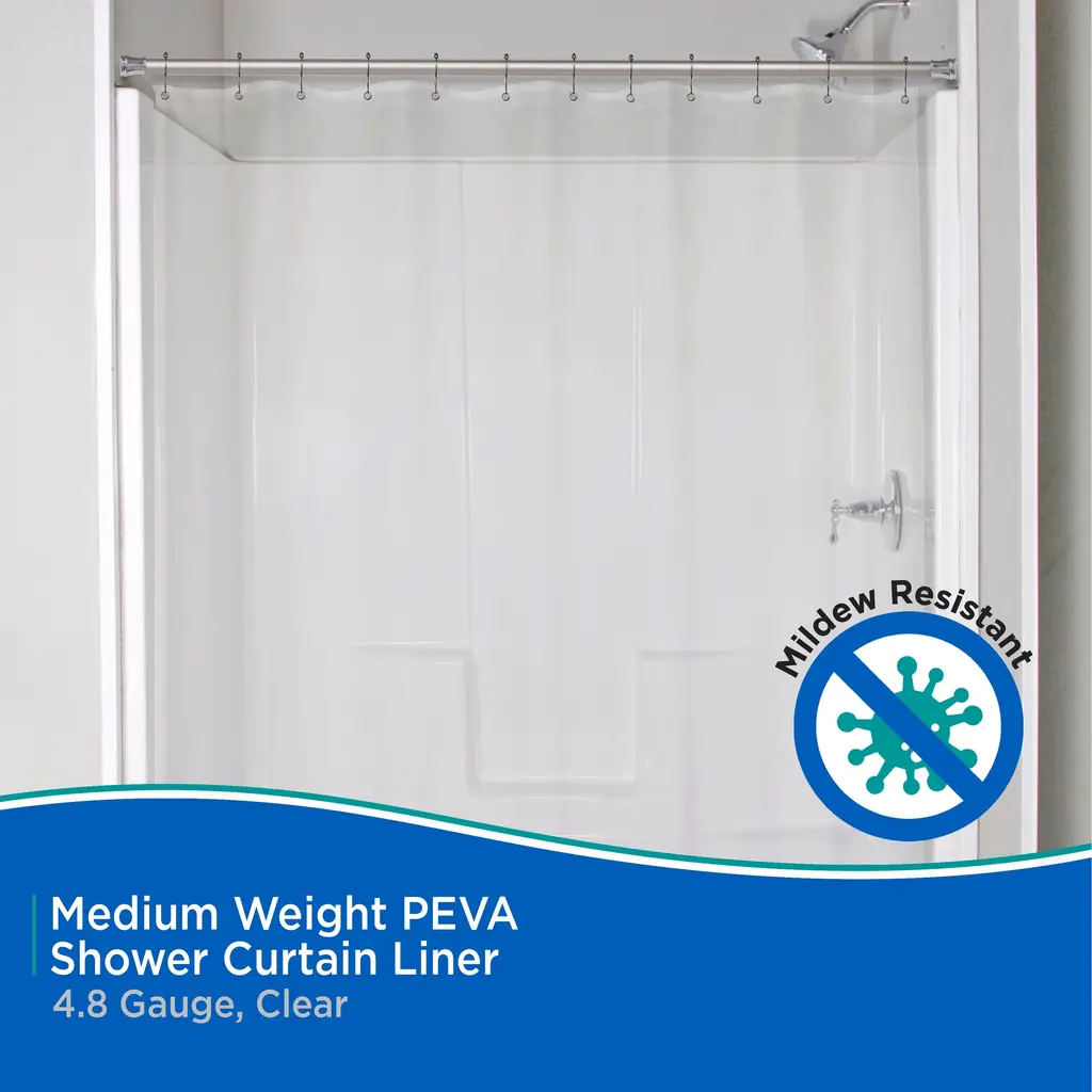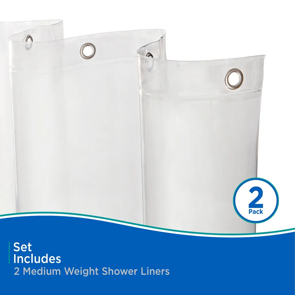 The Kenney Medium Weight PEVA Shower Curtain Liner is made of environmentally friendly PEVA, making it PVC-free and odorless. The liner has 12 rust-resistant metal grommet hang holes to prevent tearing from shower hooks and rings. The weighted hem on the waterproof liner keeps the liner in place, so water stays in your bathtub and off of the floor. Set includes two Shower Liners.Standard sized, it measures 70 inches wide by 72 inches tall (180 cm x 183 cm) to fit most showers and bath tubs.