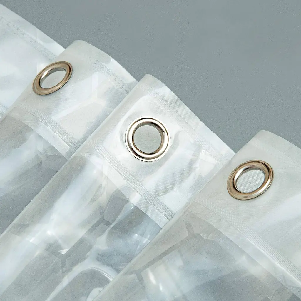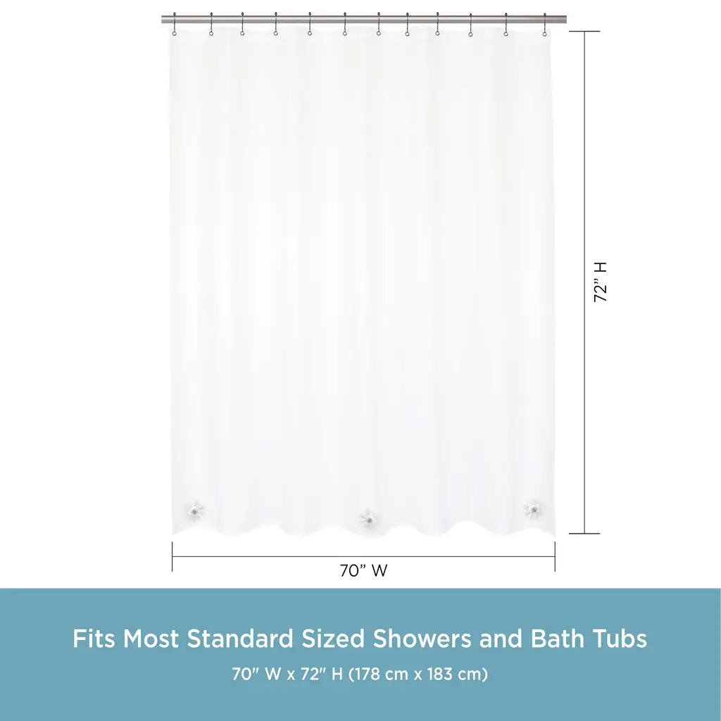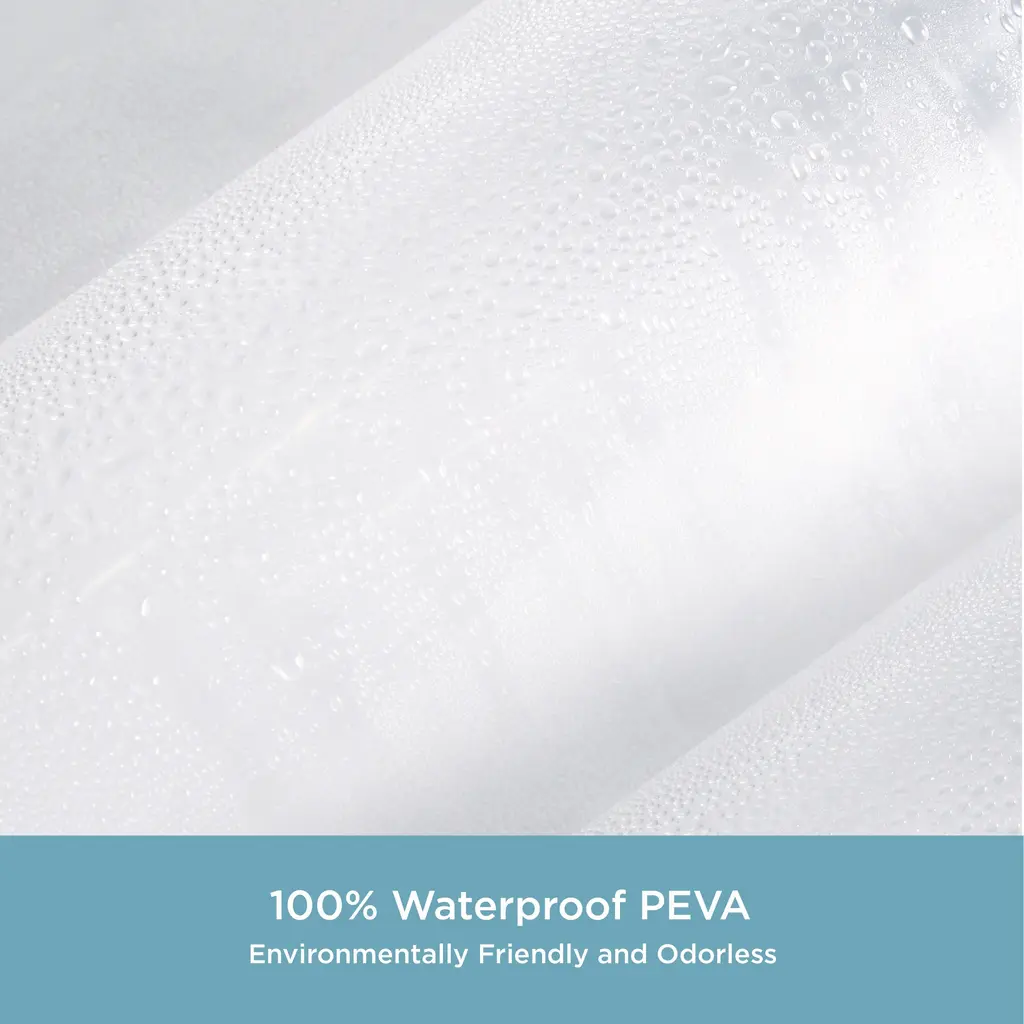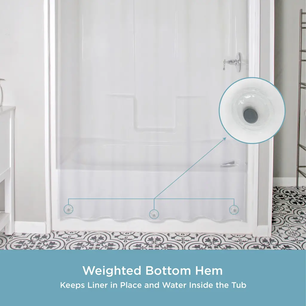 The Kenney Medium Weight PEVA Shower Curtain Liner is made of environmentally friendly PEVA, making it PVC-free and odorless. The liner has 12 rust-resistant metal grommet hang holes to prevent tearing from shower hooks and rings. The weighted hem on the waterproof liner keeps the liner in place, so water stays in your bathtub and off of the floor.Standard sized, it measures 70 inches wide by 72 inches tall (180 cm x 183 cm) to fit most showers and bath tubs.