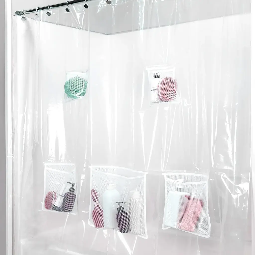 The Kenney Medium Weight PEVA Shower Curtain Liner is made of environmentally friendly PEVA, making it PVC-free and odorless. It has five self-draining mesh pockets to expand your bathroom storage. Use it as a liner to hold shower essentials, or use it as a curtain to hold personal care items. The liner has 12 rust-resistant metal grommet hang holes to prevent tearing from shower hooks and rings.Standard sized, it measures 70 inches wide by 72 inches tall (180 cm x 183 cm) to fit most showers and bath tubs.