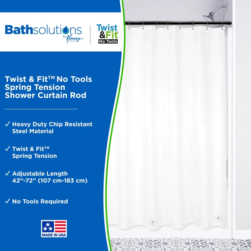 The Kenney Twist & Fit No Tools Spring Tension Shower Curtain Rod is easy to install without tools. Measuring 42-72", this shower rod is perfect for standard sized bathtubs or showers. Made of heavy-duty steel, this shower rod is coated with a chip resistant material to prevent rust over time. The non-slip, non-scratch end caps mean no damage to your wall or tile. The end caps include ring locks to keep your shower curtain against the wall, preventing drafts.To install: Extend rod 1-1.5" beyond the width of your shower opening, then compress the ends of the rod together and release into place to secure.