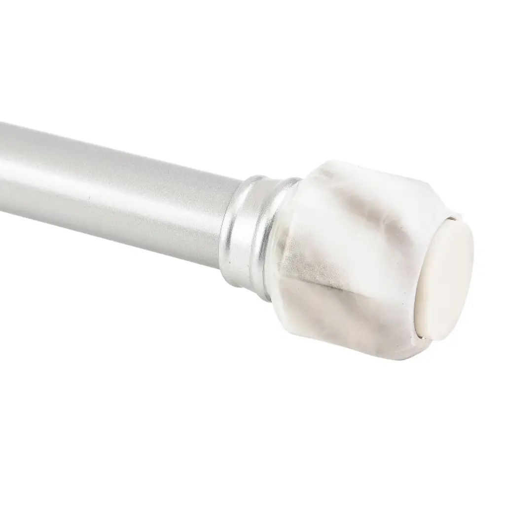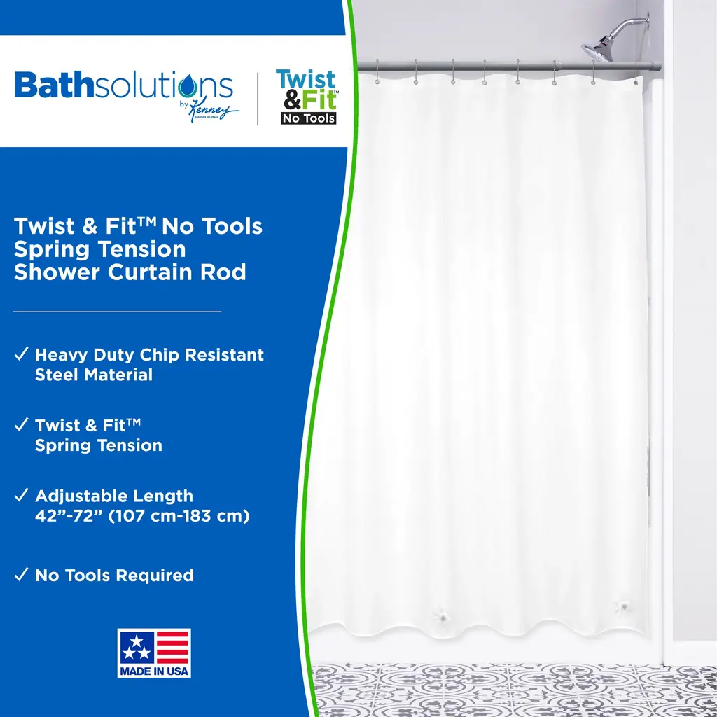 The Kenney Twist & Fit No Tools Spring Tension Shower Curtain Rod is easy to install without tools. Measuring 42-72", this shower rod is perfect for standard sized bathtubs or showers. Made of heavy-duty steel, this shower rod is coated with a chip resistant material to prevent rust over time. The non-slip, non-scratch end caps mean no damage to your wall or tile. The end caps include ring locks to keep your shower curtain against the wall, preventing drafts.To install: Extend rod 1-1.5" beyond the width of your shower opening, then compress the ends of the rod together and release into place to secure.