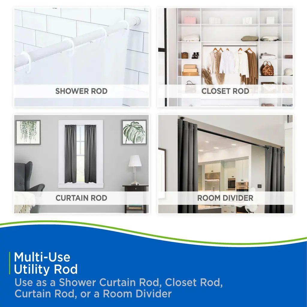 The Kenney Spring Tension Utility Rod is easy to install without tools. Use it as a shower curtain rod in standard and oversized bathtubs, or for added storage in closets, laundry rooms, and more. Made of heavy-duty steel, this utility rod is coated with a chip resistant material to prevent rust over time.The non-slip, non-scratch end caps mean no damage to your wall or tile, making this a good solution for rentals or other temporary installments. The end caps include ring locks to keep your shower curtain against the wall, preventing drafts.To install: Extend rod 1-1.5" beyond the width of your shower opening, then compress the ends of the rod together and release into place to secure.