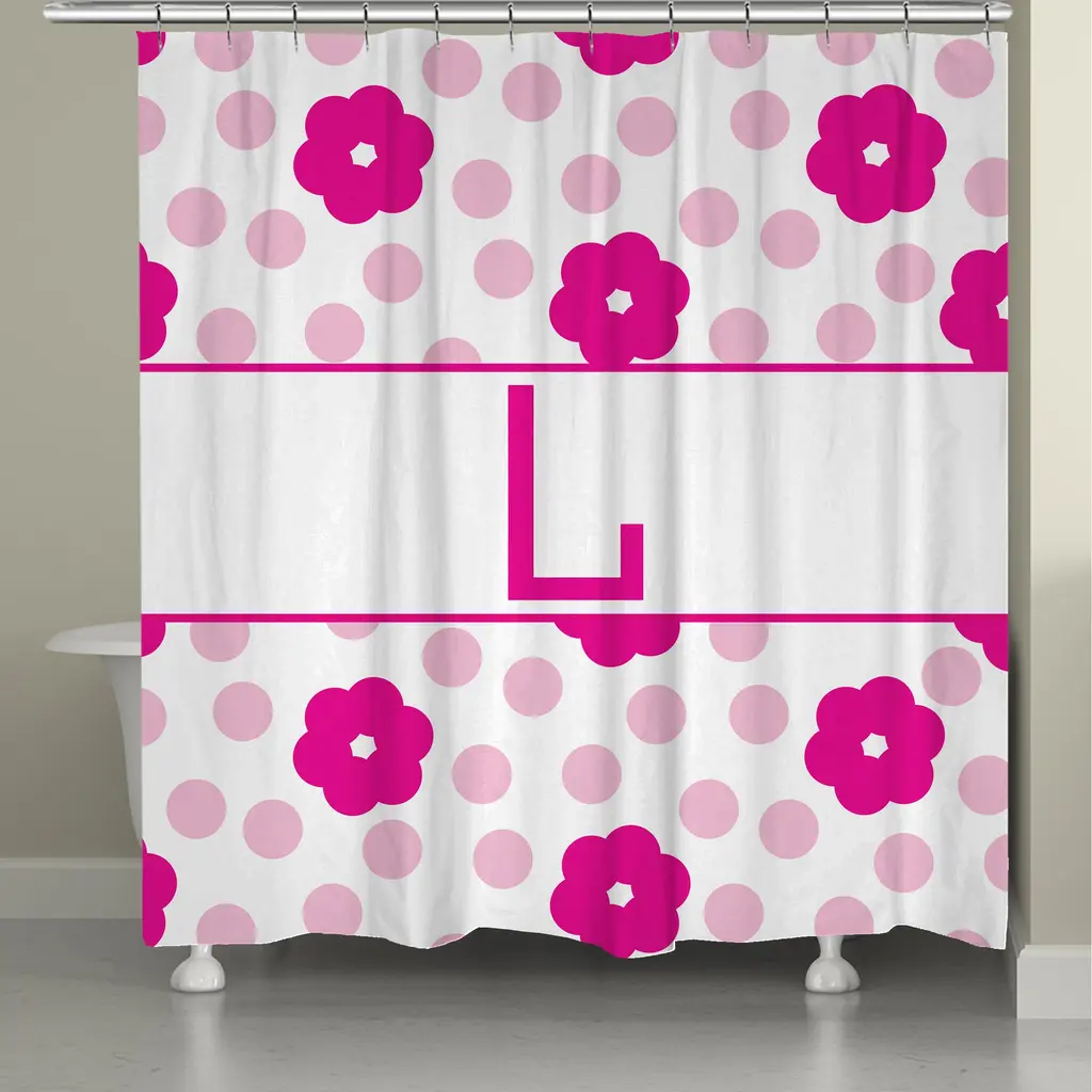 Give your bathroom a personalized touch with this fun, flower and polka dotted shower curtain. This shower curtain is digitally printed to create crisp, vibrant colors and images. It is made to order with 12 button holes at the top for shower hook placement. Material: Polyester Pattern: Floral, kids, novelty Color: White, pinkDimensions: 71 inches high x 74 inches wide
